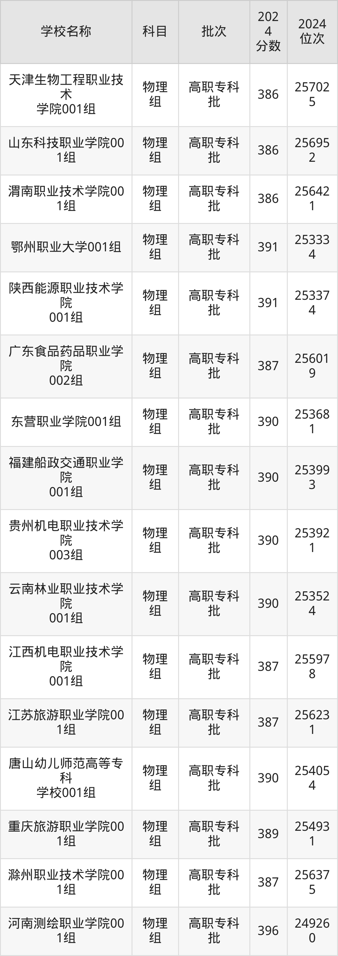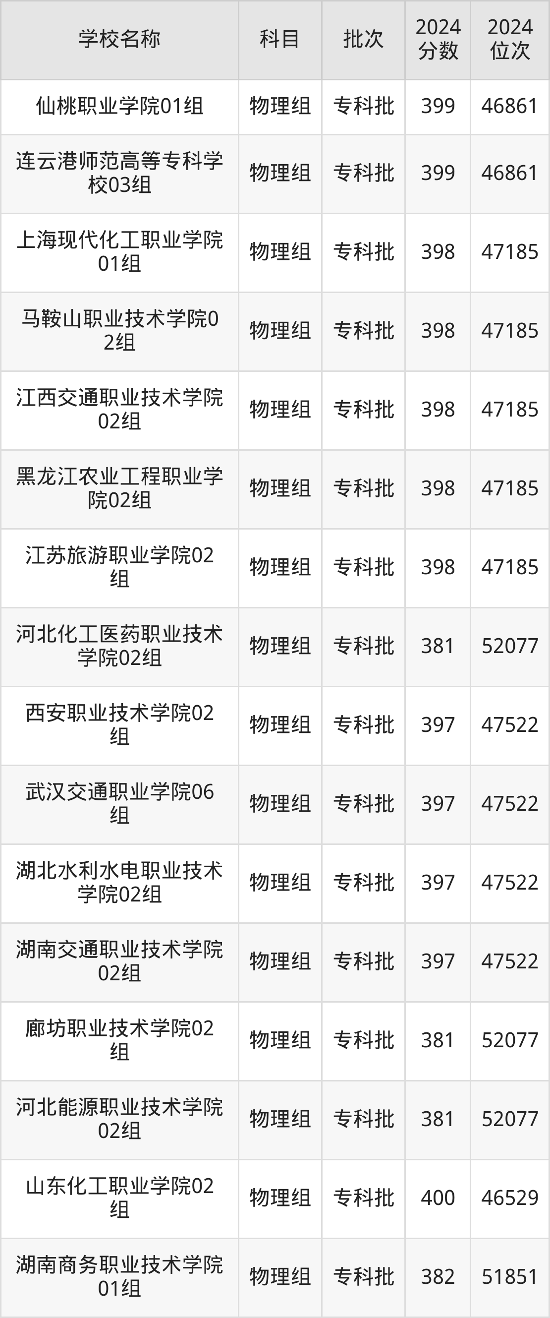 江苏高考物理组共有72所公办专科学校在380到400分之间录取,包含山东化工职业学院、徐州幼儿师范高等专科学校、江苏城乡建设职业学院、长春金融高等专科学校、河南测绘职业学院、湖南化工职业技术学院、盐城工业职业技术学院、陕西航空职业技术学院、江西现代职业技术学院、济南工程职业技术学院。