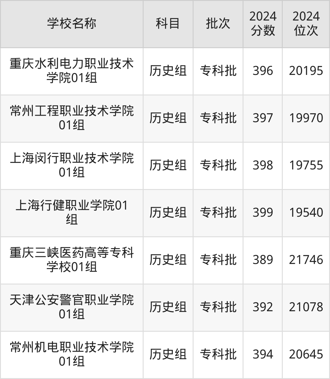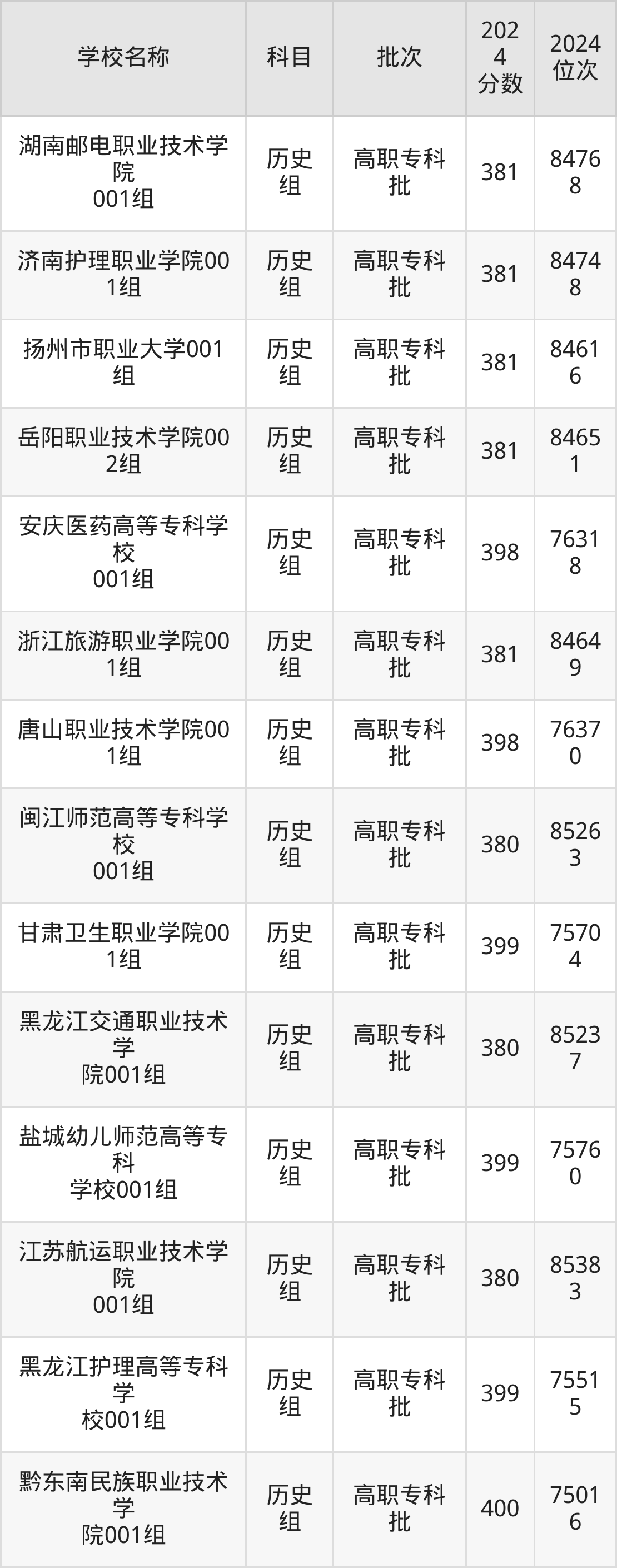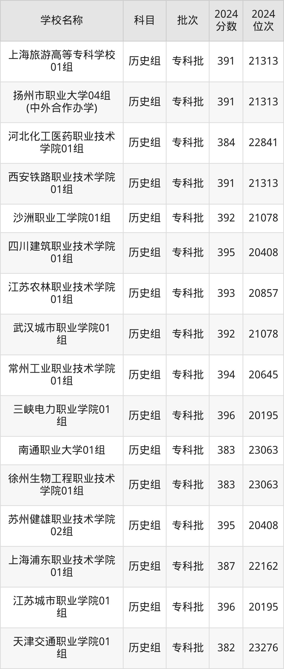 江苏高考历史组共有28所公办专科学校在380到400分之间录取,包含江苏护理职业学院、上海行健职业学院、上海闵行职业技术学院、常州工程职业技术学院、重庆水利电力职业技术学院、江苏城市职业学院、三峡电力职业学院、苏州健雄职业技术学院、四川建筑职业技术学院、哈尔滨铁道职业技术学院。