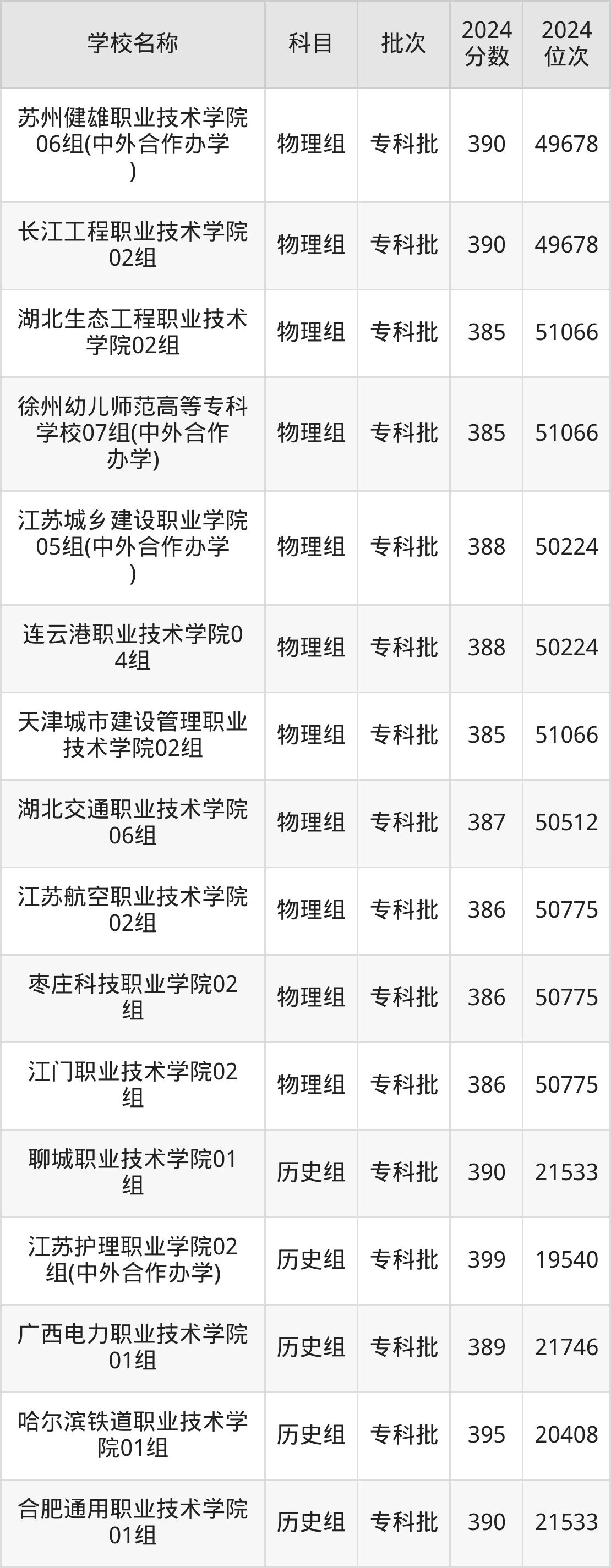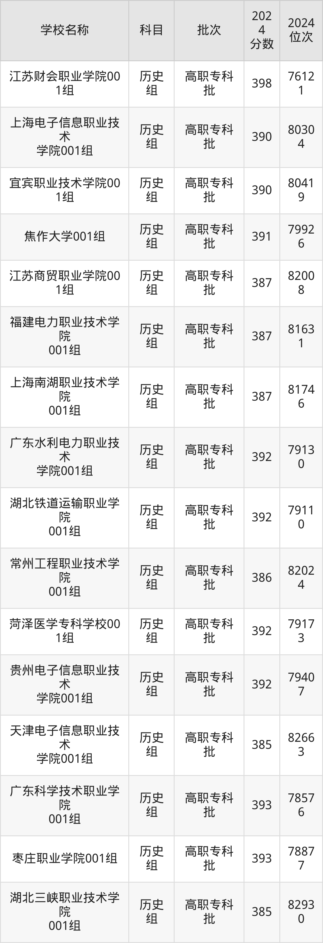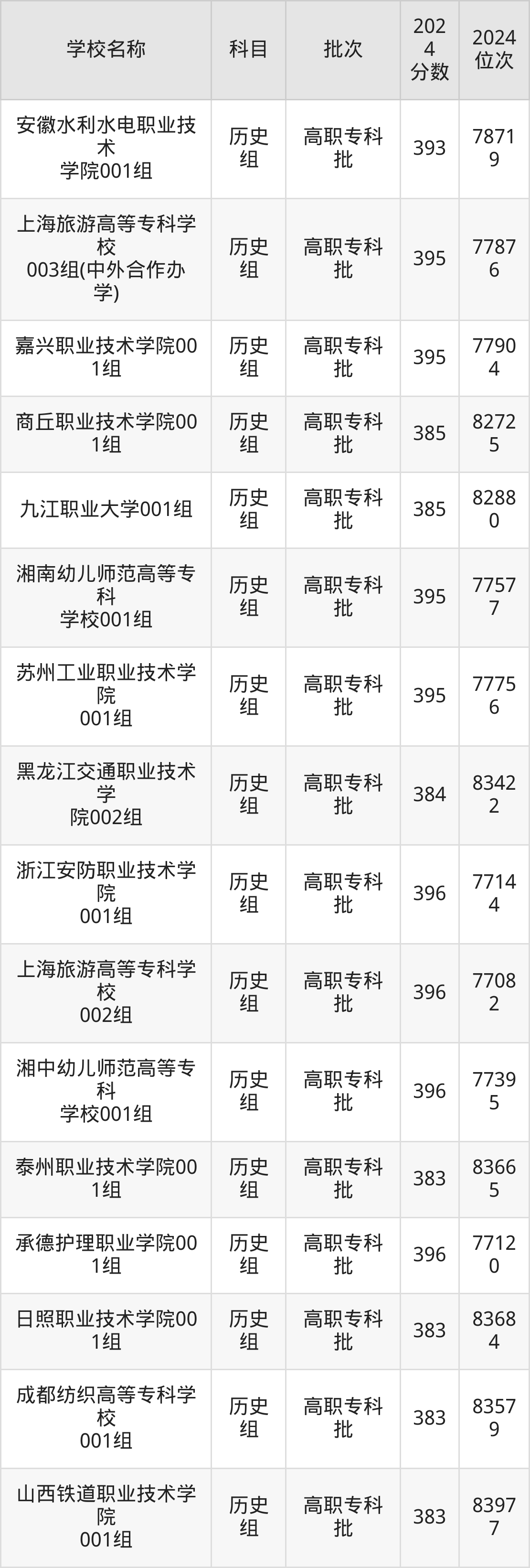 江苏高考历史组共有28所公办专科学校在380到400分之间录取,包含江苏护理职业学院、上海行健职业学院、上海闵行职业技术学院、常州工程职业技术学院、重庆水利电力职业技术学院、江苏城市职业学院、三峡电力职业学院、苏州健雄职业技术学院、四川建筑职业技术学院、哈尔滨铁道职业技术学院。