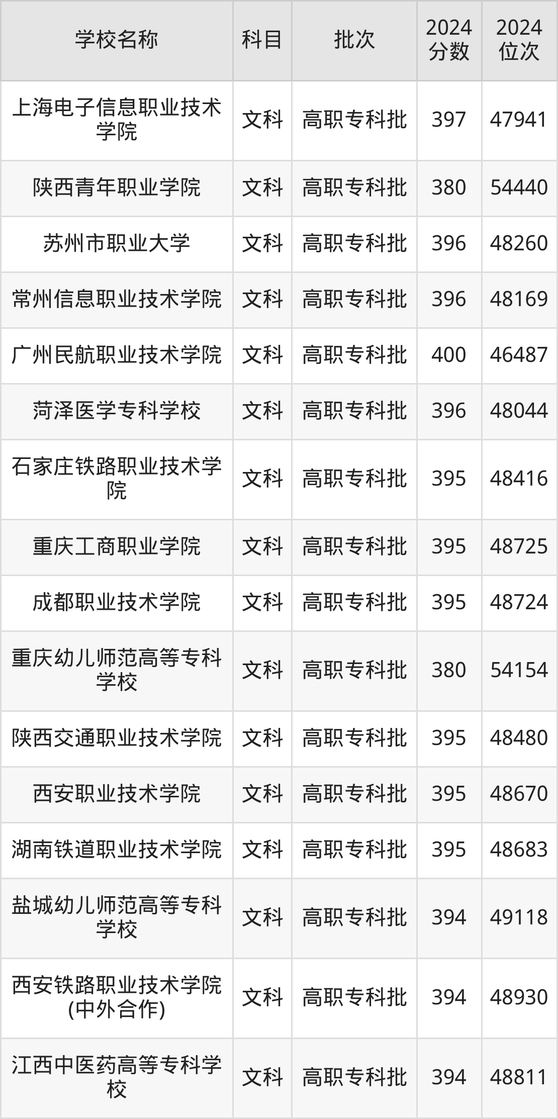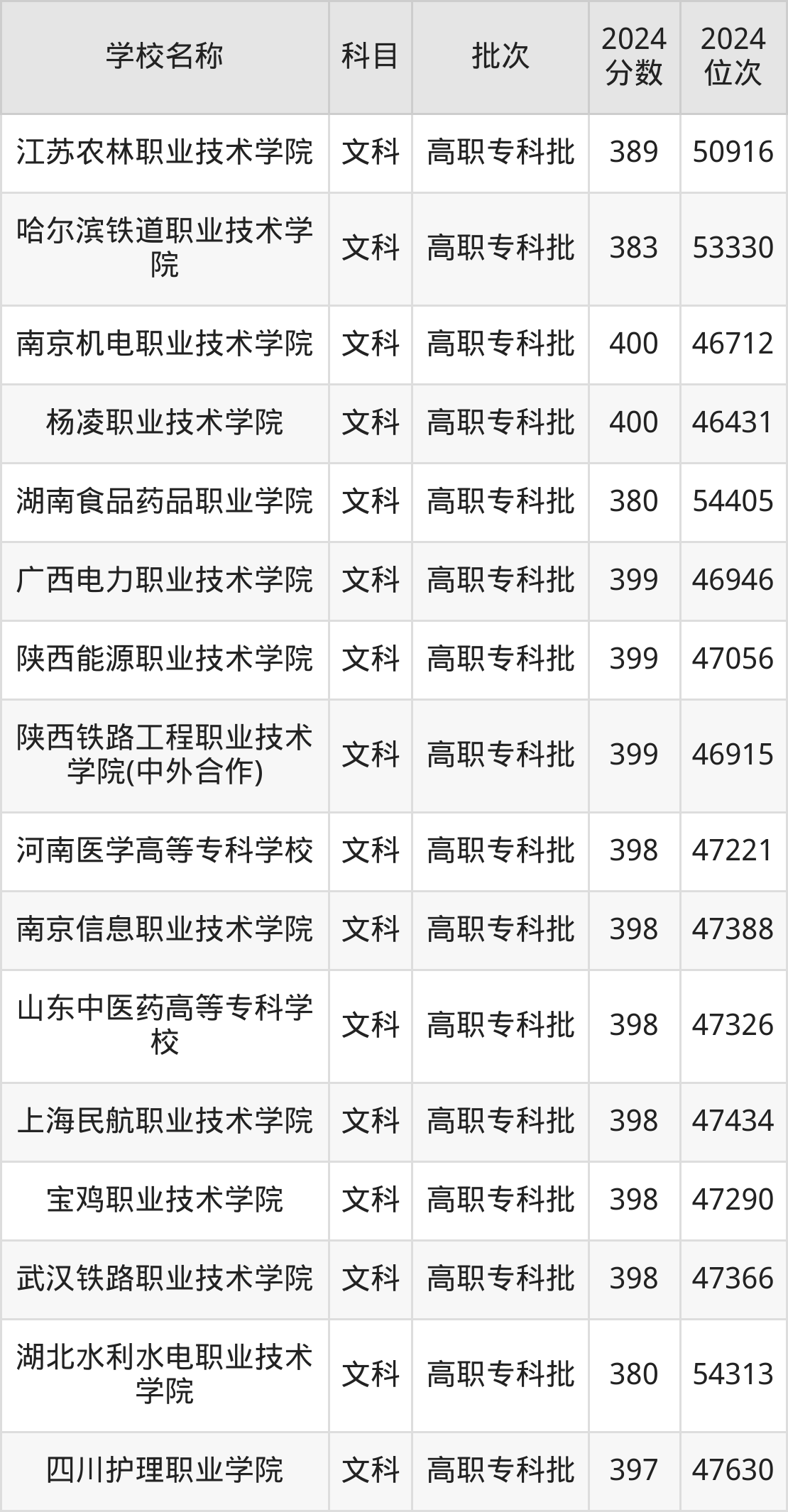 陕西高考文科共有83所公办专科学校在380到400分之间录取,包含广州民航职业技术学院、南京机电职业技术学院、杨凌职业技术学院、广西电力职业技术学院、陕西能源职业技术学院、陕西铁路工程职业技术学院(中外合作)、河南医学高等专科学校、南京信息职业技术学院、山东中医药高等专科学校、上海民航职业技术学院。