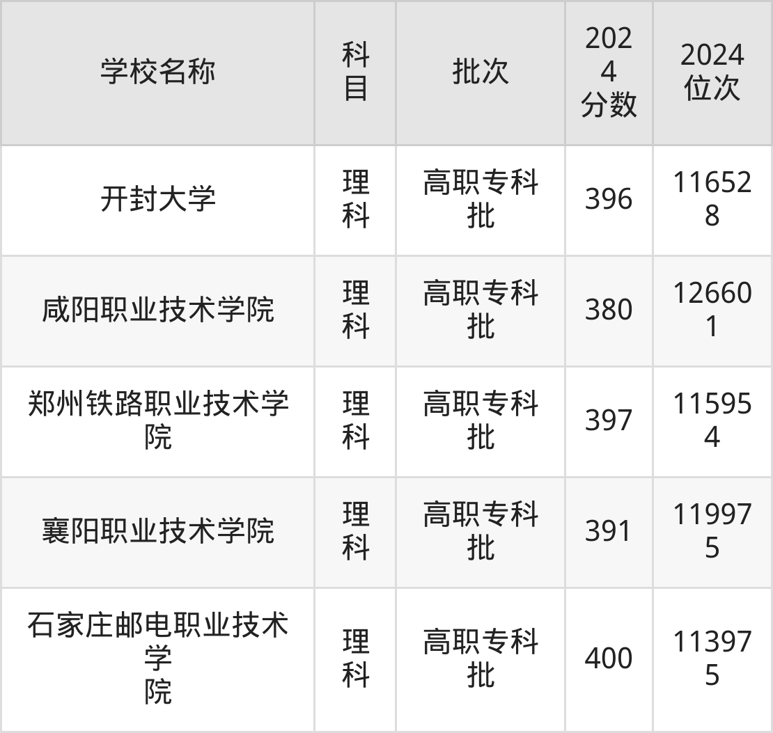 陕西高考理科共有34所公办专科学校在380到400分之间录取,包含连云港职业技术学院、石家庄邮电职业技术学院、郑州铁路职业技术学院、开封大学、山东医学高等专科学校、安徽警官职业学院、河南推拿职业学院、山东畜牧兽医职业学院、天津电子信息职业技术学院、漯河医学高等专科学校。