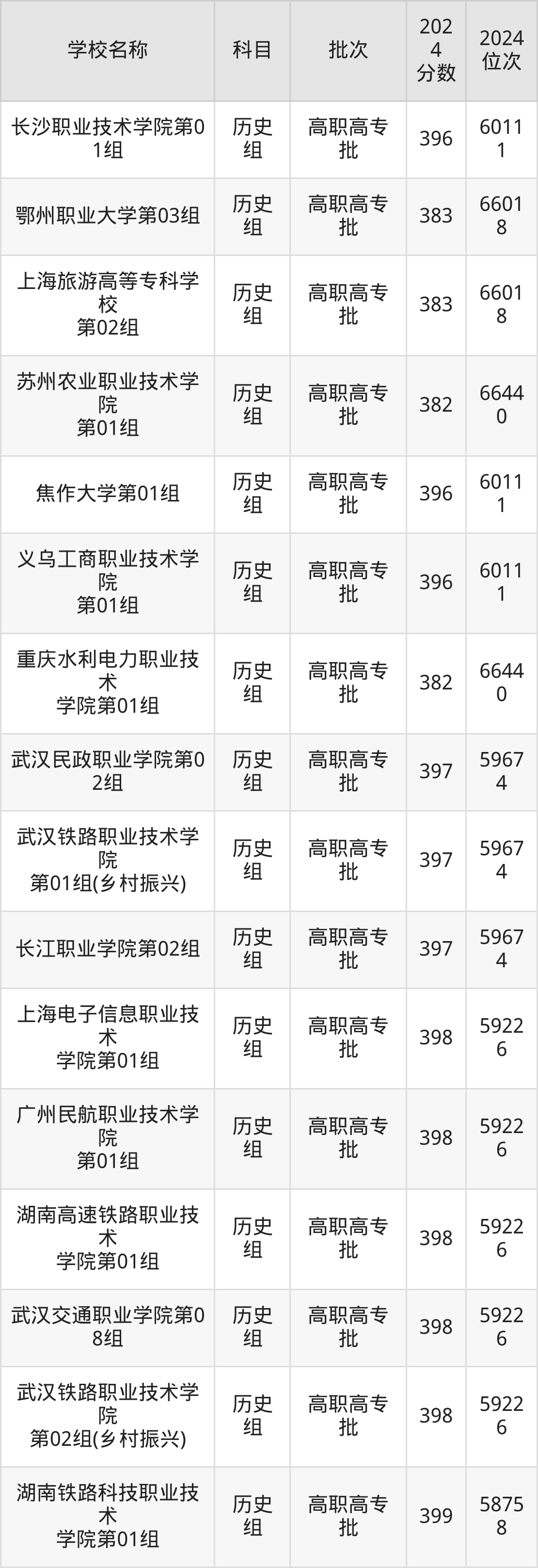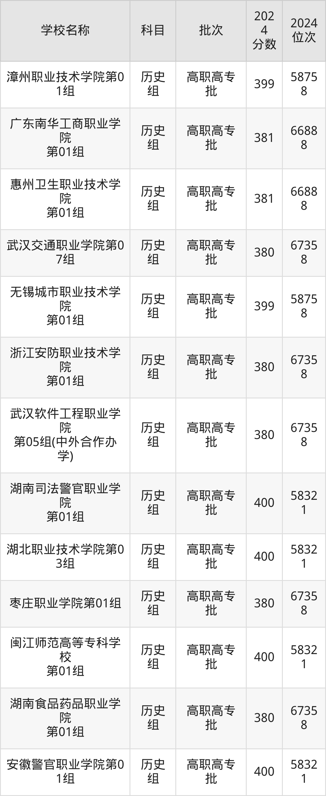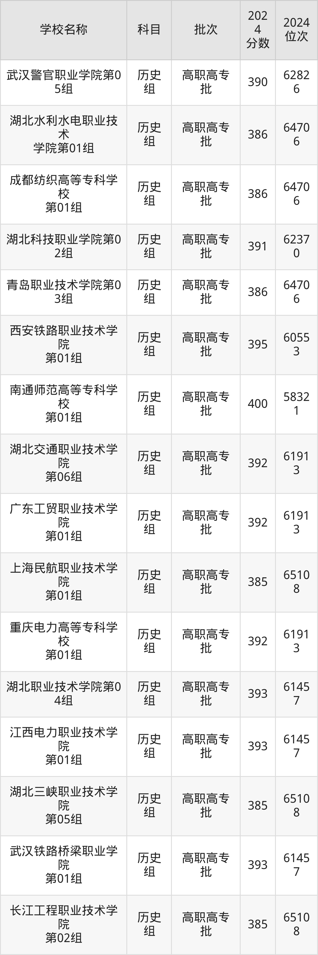 湖北高考历史组共有63所公办专科学校在380到400分之间录取,包含南通师范高等专科学校、安徽警官职业学院、闽江师范高等专科学校、湖北职业技术学院、湖南司法警官职业学院、无锡城市职业技术学院、漳州职业技术学院、湖南铁路科技职业技术学院、武汉铁路职业技术学院、武汉交通职业学院。