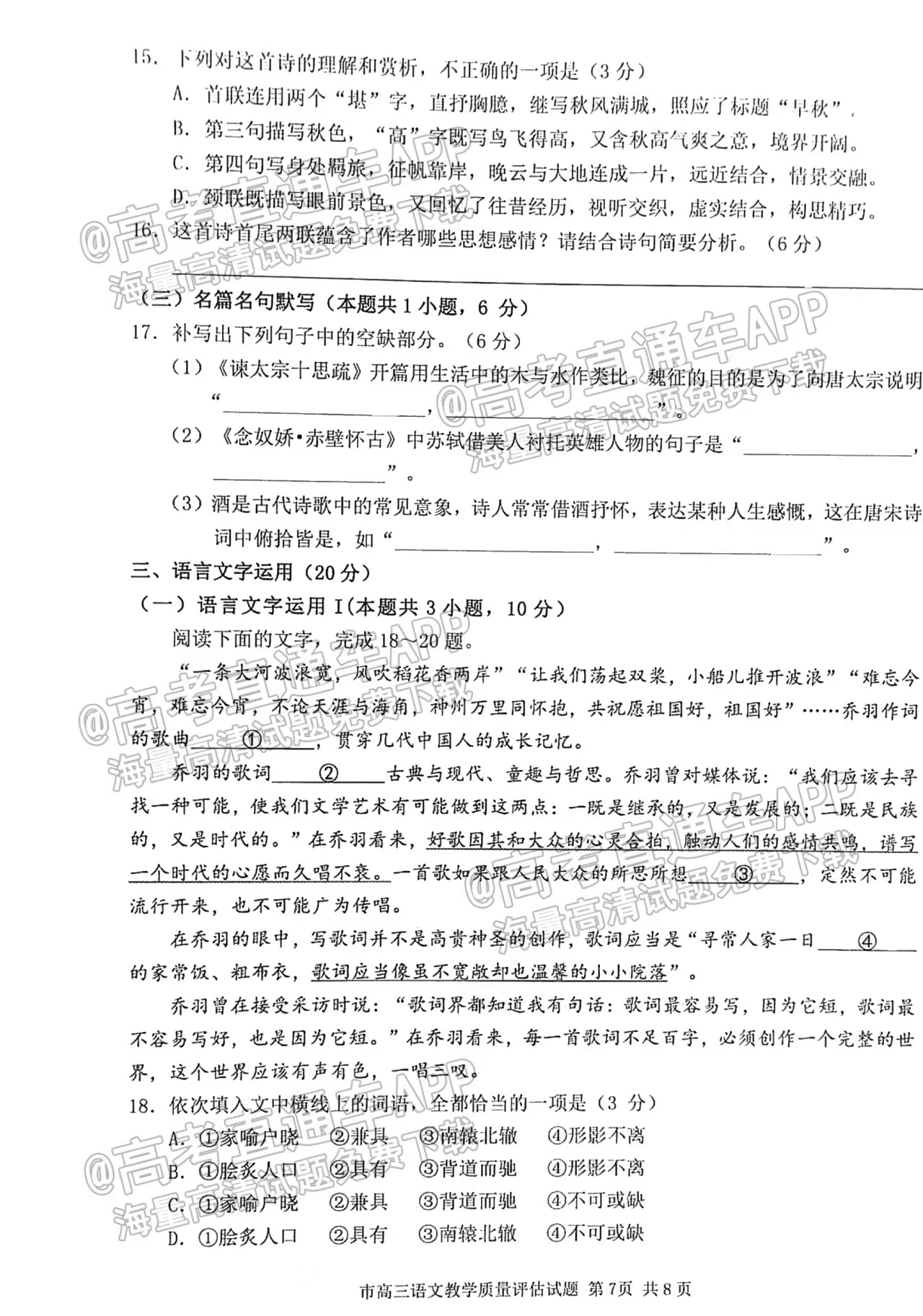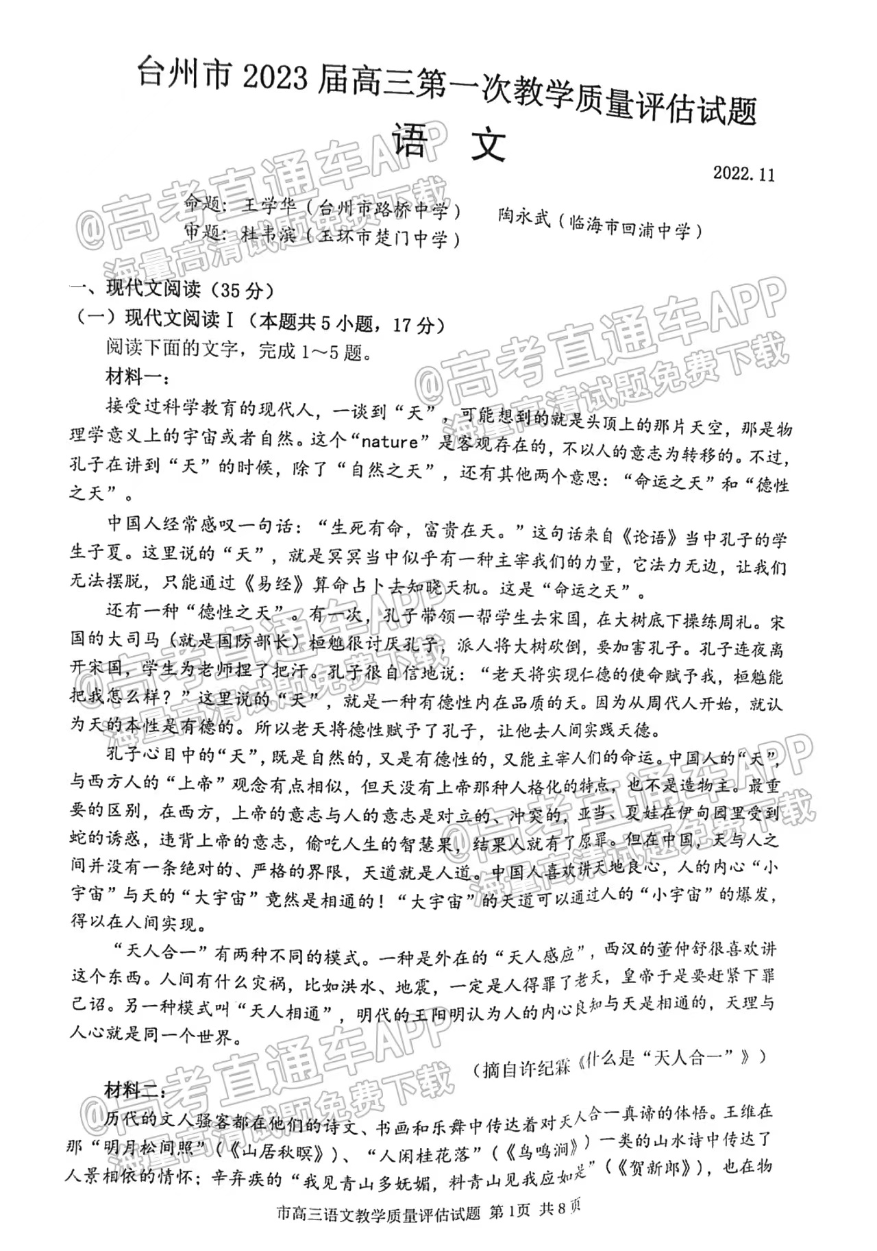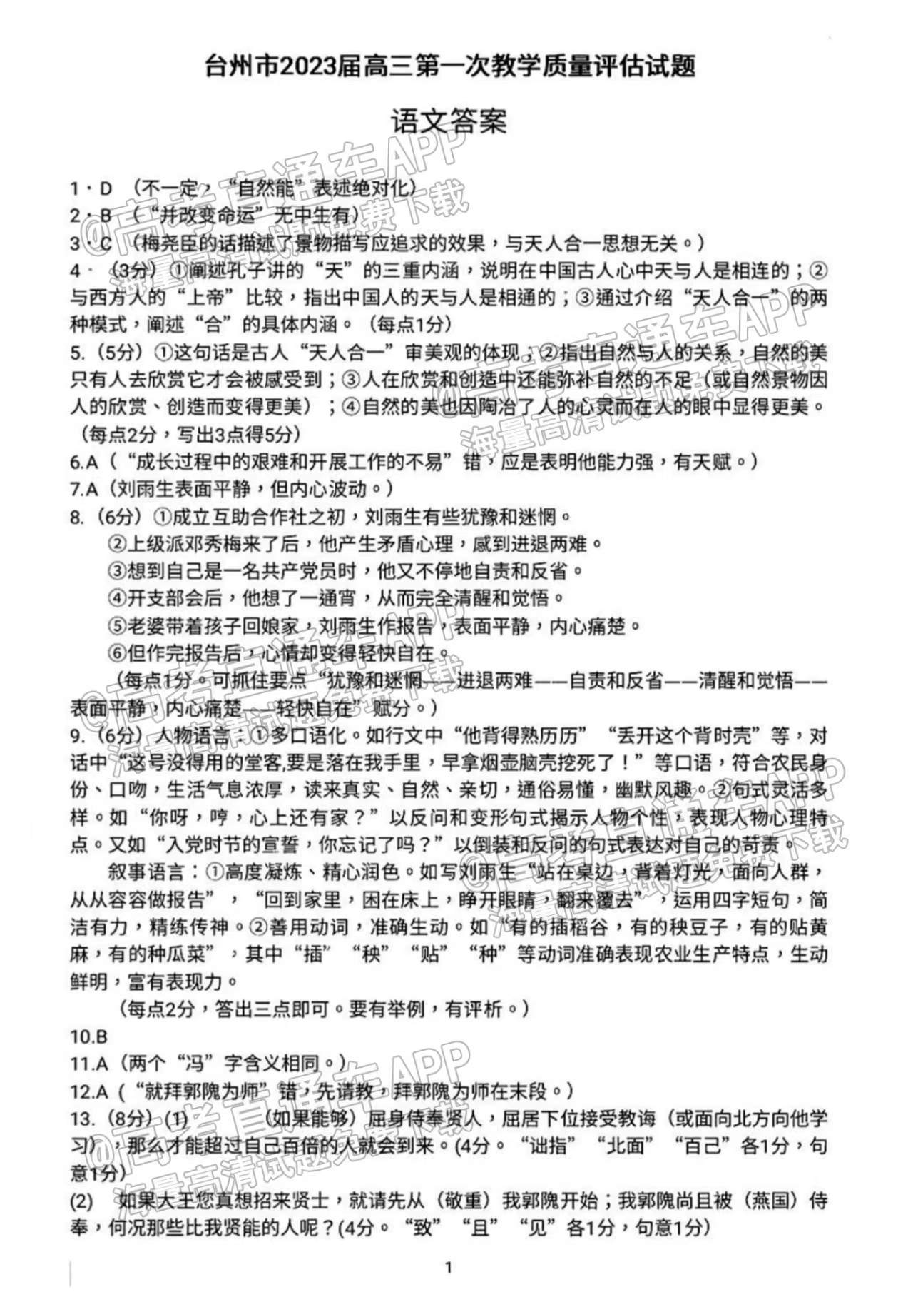 2023浙江台州一模将于11月16日开考,本次的考试科目一共有九门,分别是语文,数学、英语、物理、化学、生物、政治、历史、地理。以下是语文的试卷及答案解析,详情如下: