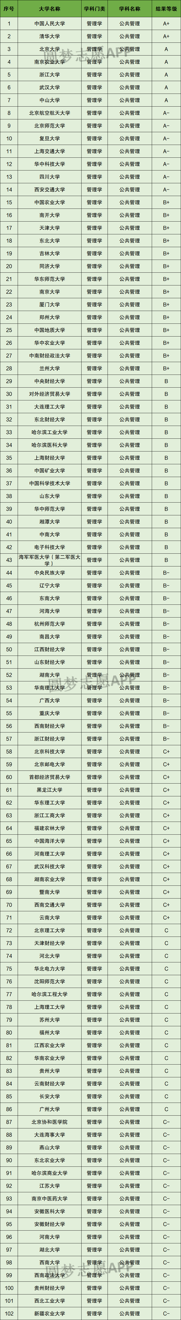 以下为第四轮学科评估中公共管理学科的全部排名,共计102所大学。