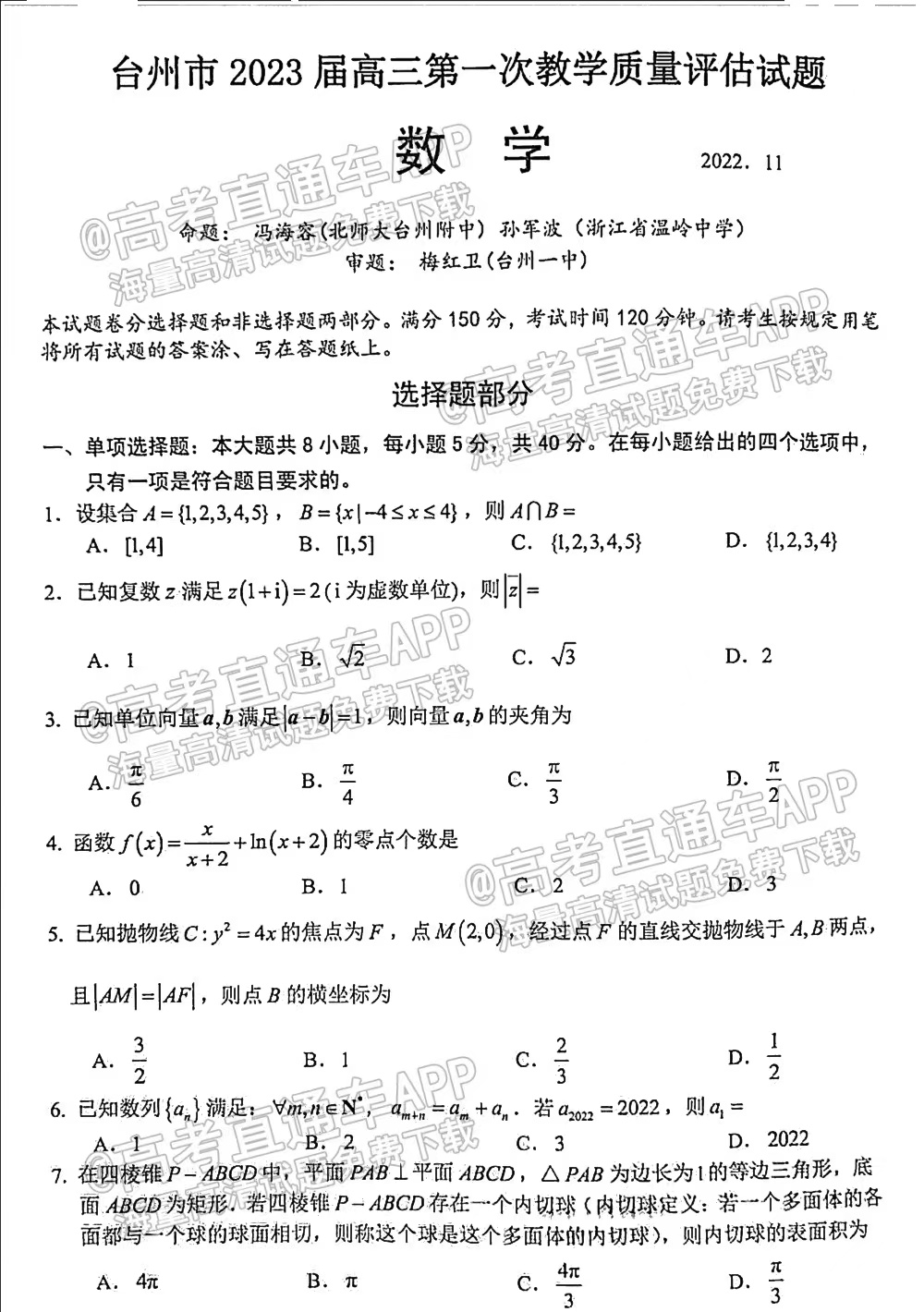 2023浙江台州一模将于11月16日开考,本次的考试科目一共有九门,分别是语文,数学、英语、物理、化学、生物、政治、历史、地理。以下是数学的试卷及答案解析,详情如下: