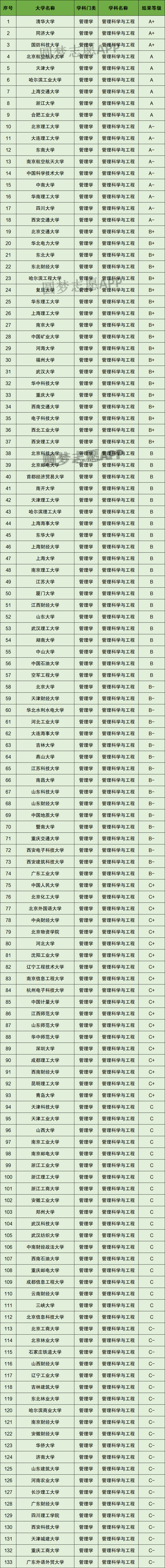 以下为第四轮学科评估中管理科学与工程学科的全部排名,共计133所大学。
