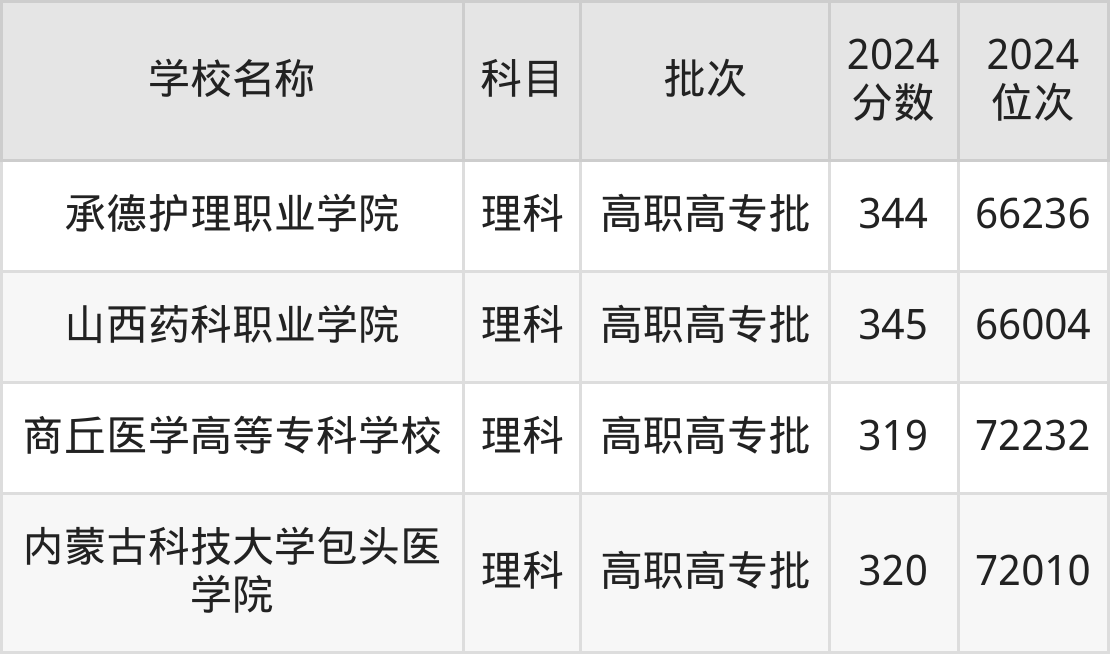 内蒙古高考文科共有14所医科大学在300到350分之间录取,包含西安医学高等专科学校、江西医学高等专科学校、唐山职业技术学院、郑州澍青医学高等专科学校、石家庄医学高等专科学校、辽宁何氏医学院、天津医学高等专科学校、山东中医药高等专科学校、运城护理职业学院、承德护理职业学院。