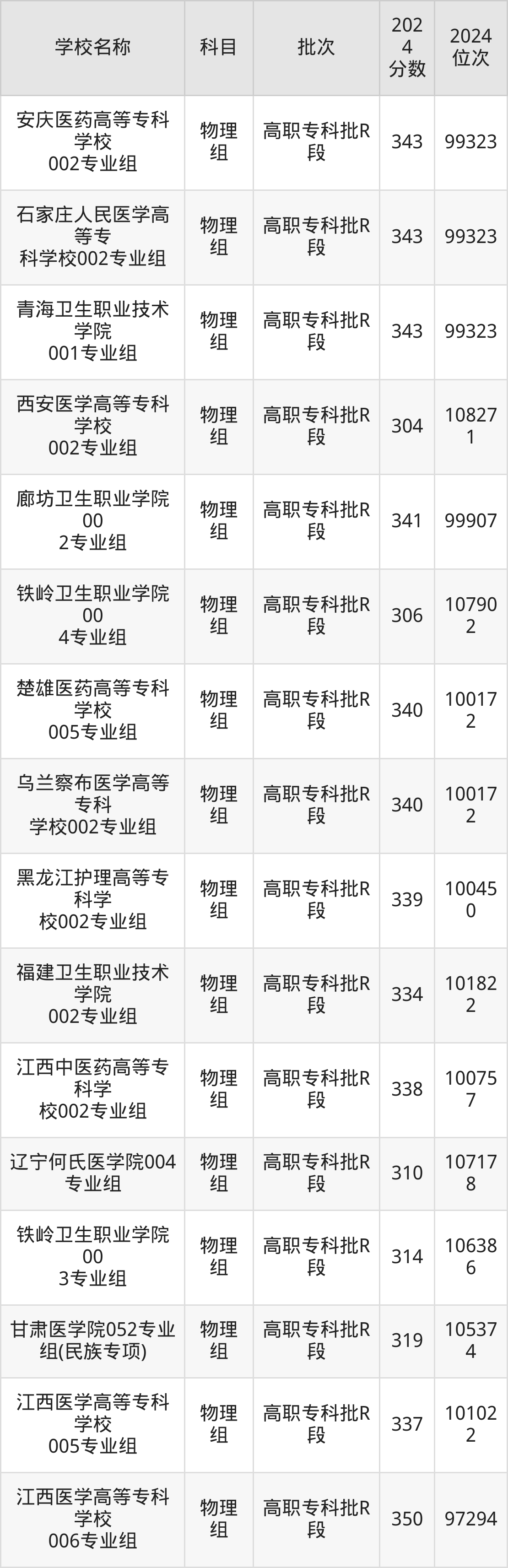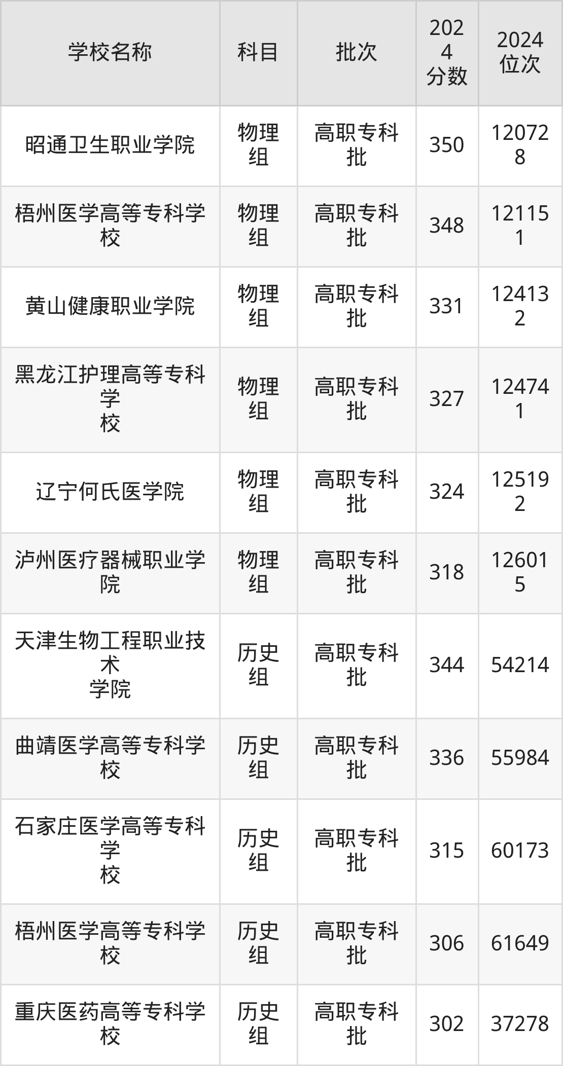 重庆高考物理组共有6所医科大学在300到350分之间录取,包含昭通卫生职业学院、梧州医学高等专科学校、黄山健康职业学院、黑龙江护理高等专科学校、辽宁何氏医学院、泸州医疗器械职业学院。