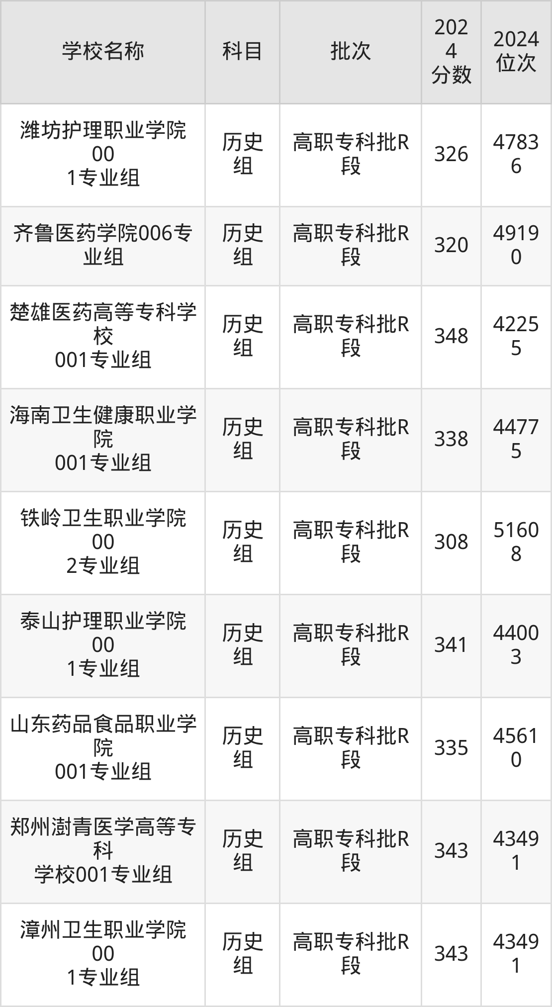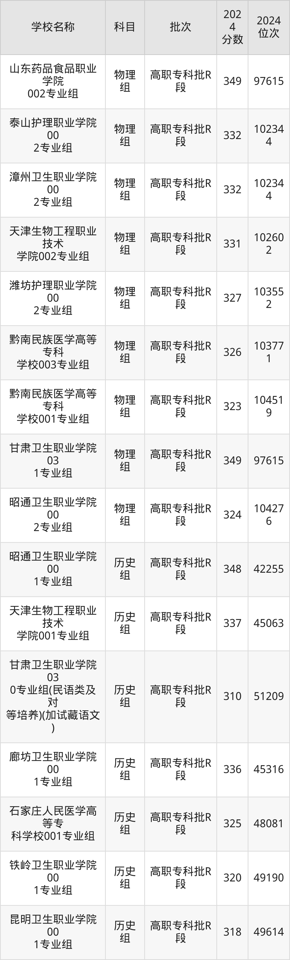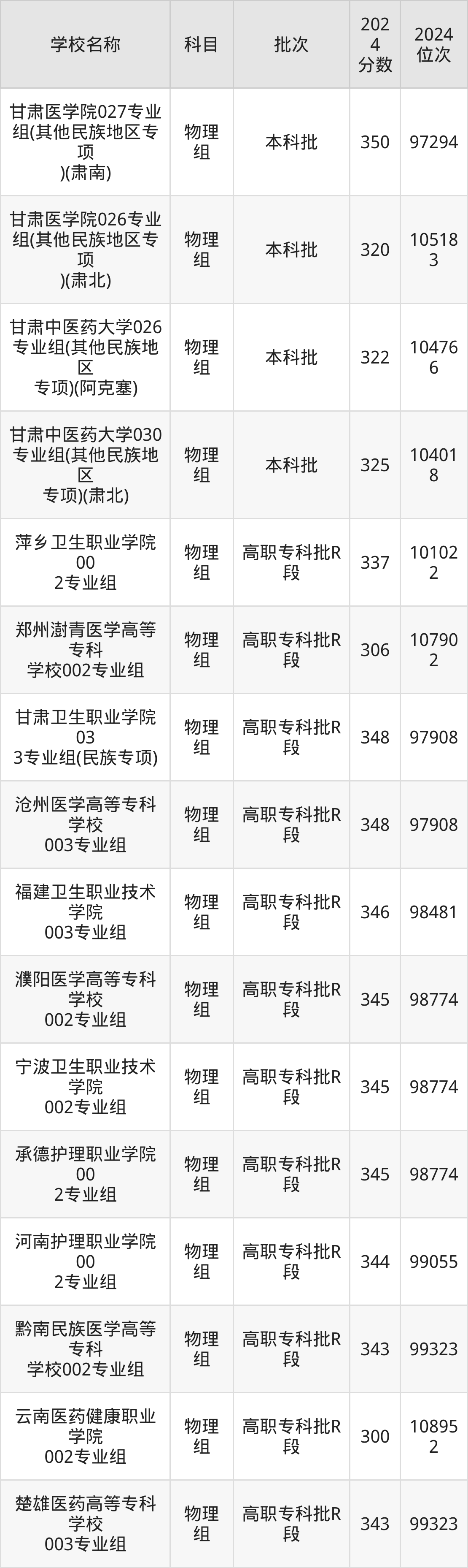 甘肃高考历史组共有15所医科大学在300到350分之间录取,包含楚雄医药高等专科学校、昭通卫生职业学院、漳州卫生职业学院、郑州澍青医学高等专科学校、泰山护理职业学院、海南卫生健康职业学院、天津生物工程职业技术学院、廊坊卫生职业学院、山东药品食品职业学院、潍坊护理职业学院。