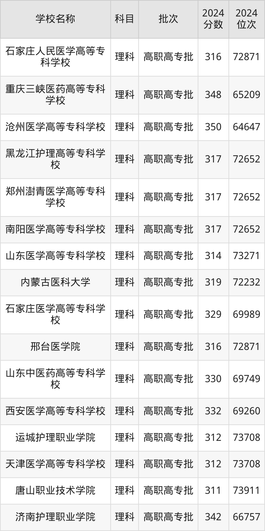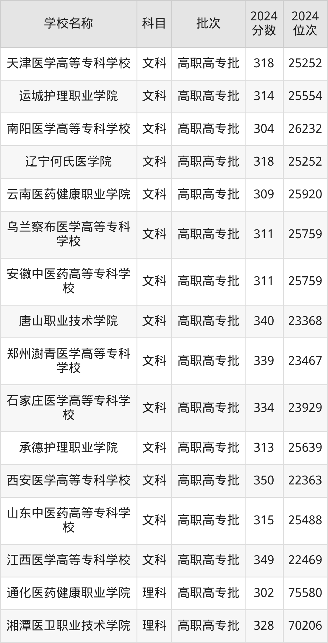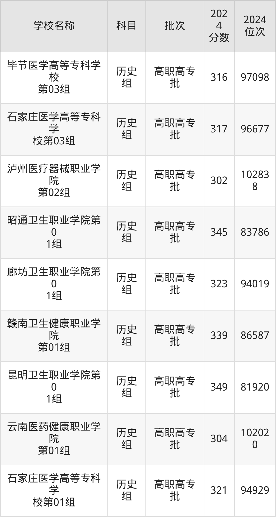 甘肃高考历史组共有15所医科大学在300到350分之间录取,包含楚雄医药高等专科学校、昭通卫生职业学院、漳州卫生职业学院、郑州澍青医学高等专科学校、泰山护理职业学院、海南卫生健康职业学院、天津生物工程职业技术学院、廊坊卫生职业学院、山东药品食品职业学院、潍坊护理职业学院。
