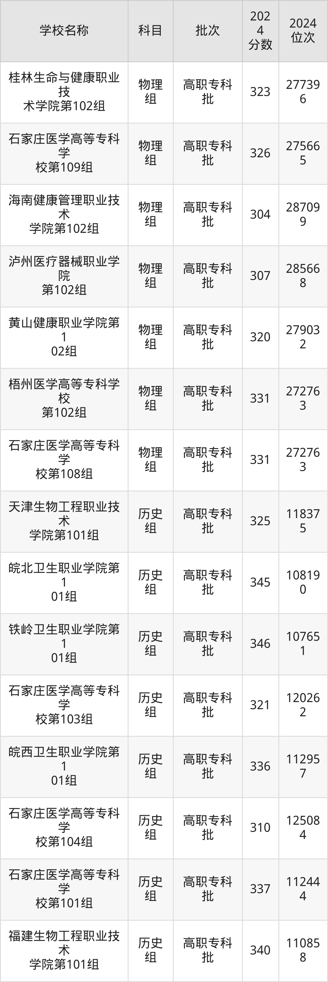 湖南高考历史组共有6所医科大学在300到350分之间录取,包含铁岭卫生职业学院、皖北卫生职业学院、福建生物工程职业技术学院、石家庄医学高等专科学校、皖西卫生职业学院、天津生物工程职业技术学院。