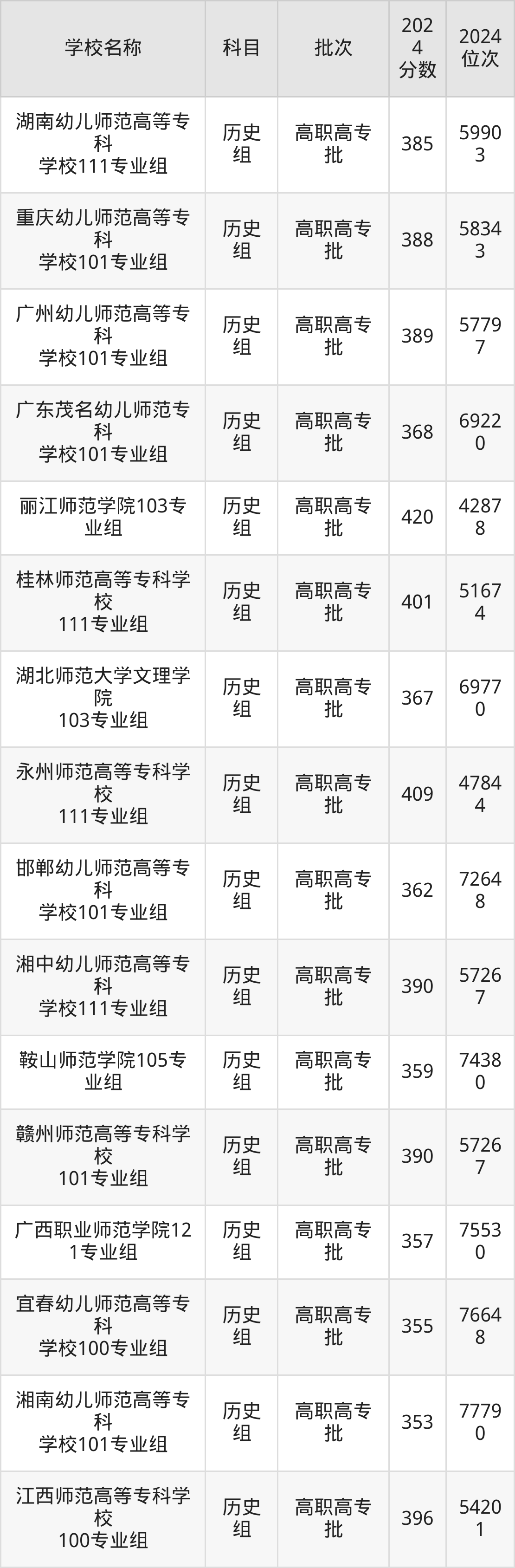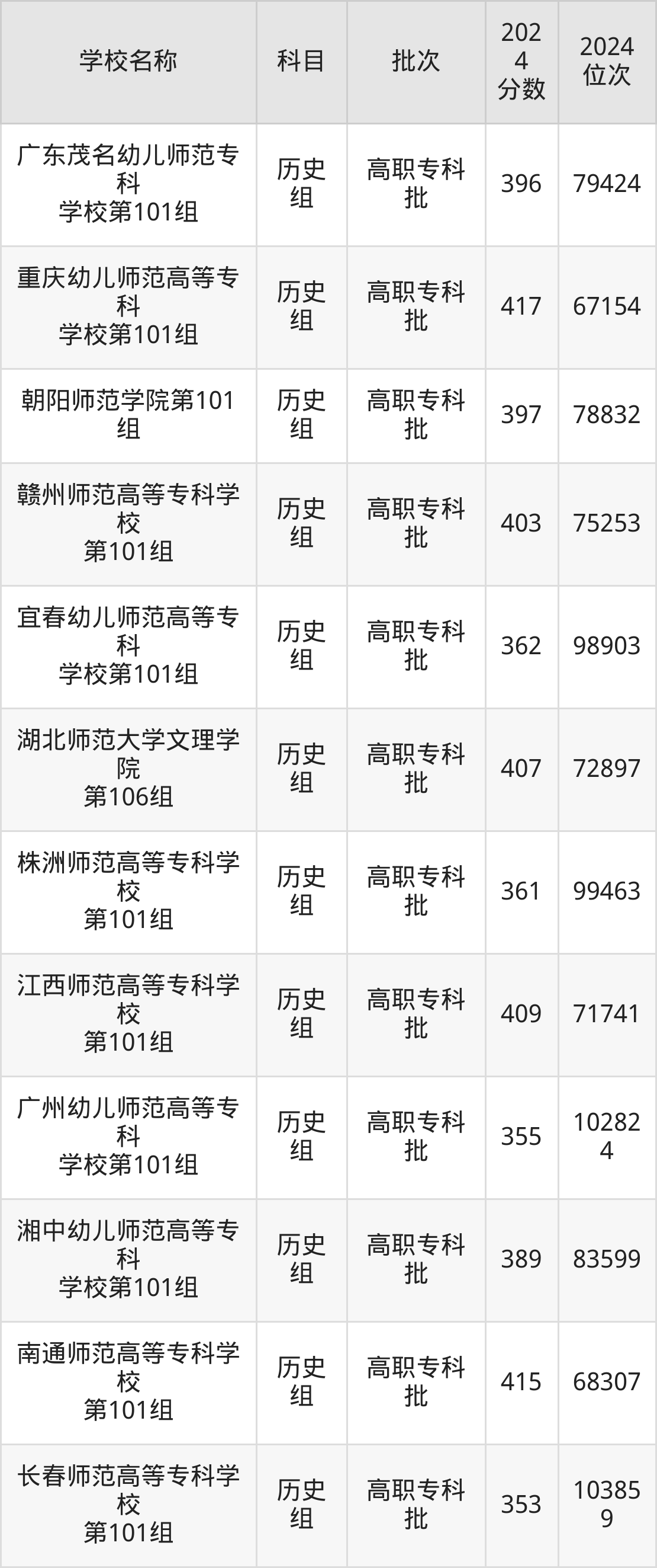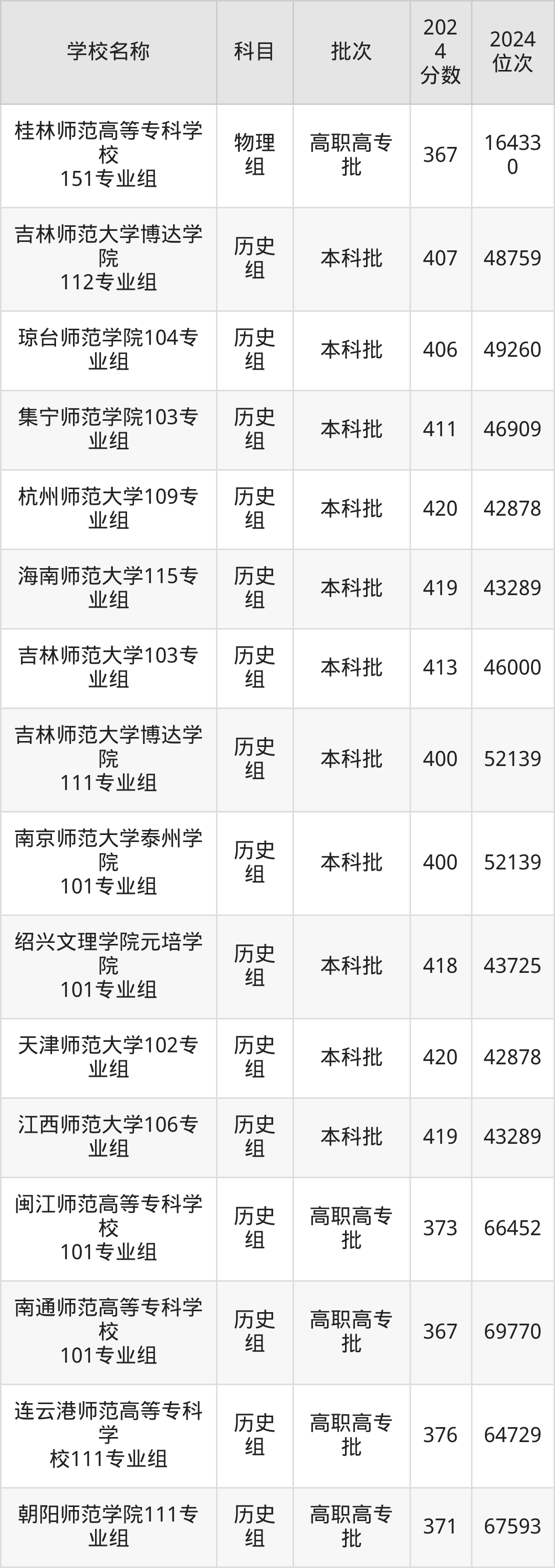 湖北高考历史组共有11所师范大学在350到420分之间录取,包含连云港师范高等专科学校、汉江师范学院、重庆幼儿师范高等专科学校、南通师范高等专科学校、闽江师范高等专科学校、浙江特殊教育职业学院、湘中幼儿师范高等专科学校、赣州师范高等专科学校、马鞍山师范高等专科学校、上饶幼儿师范高等专科学校。