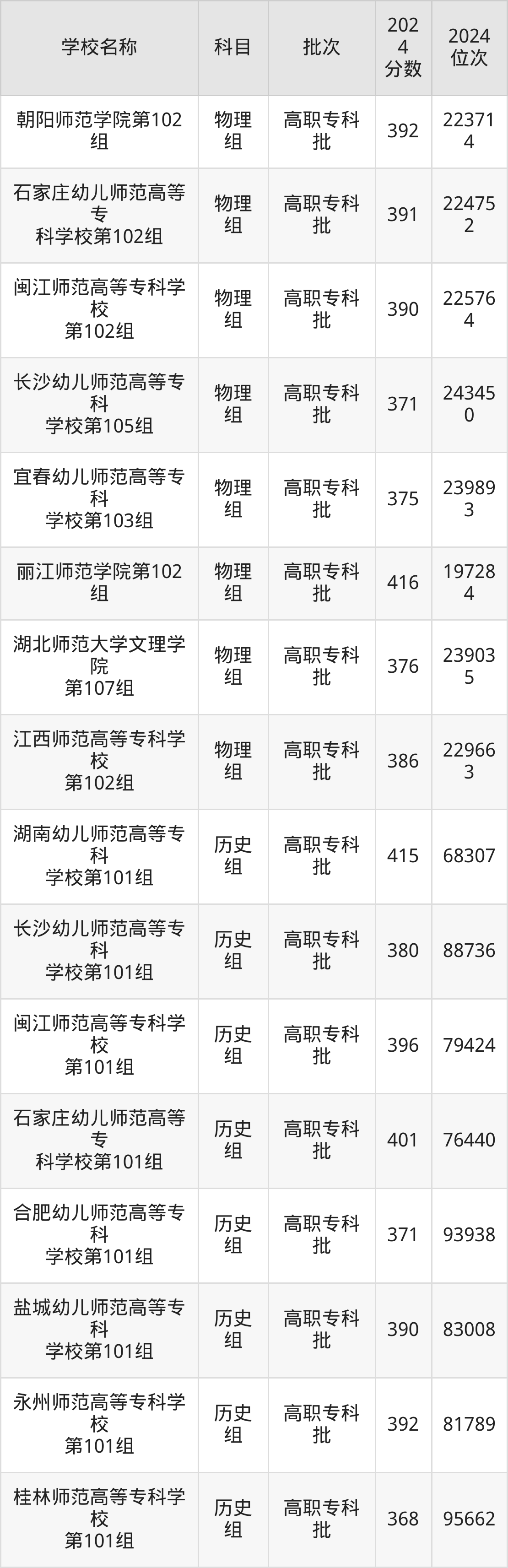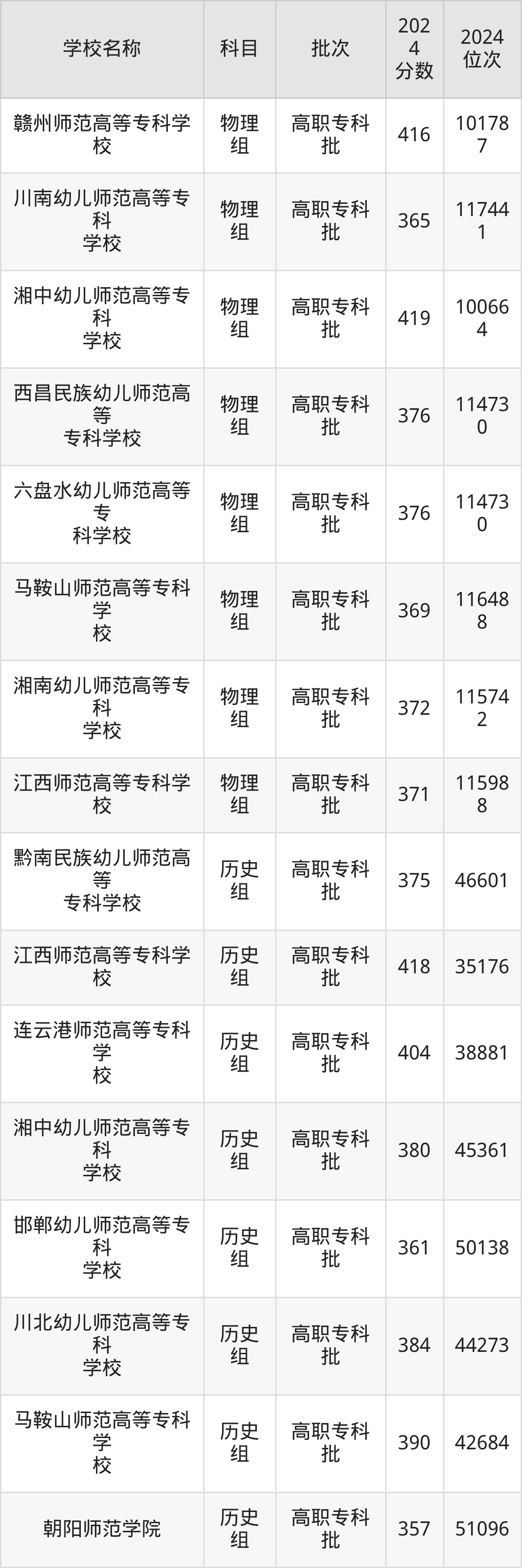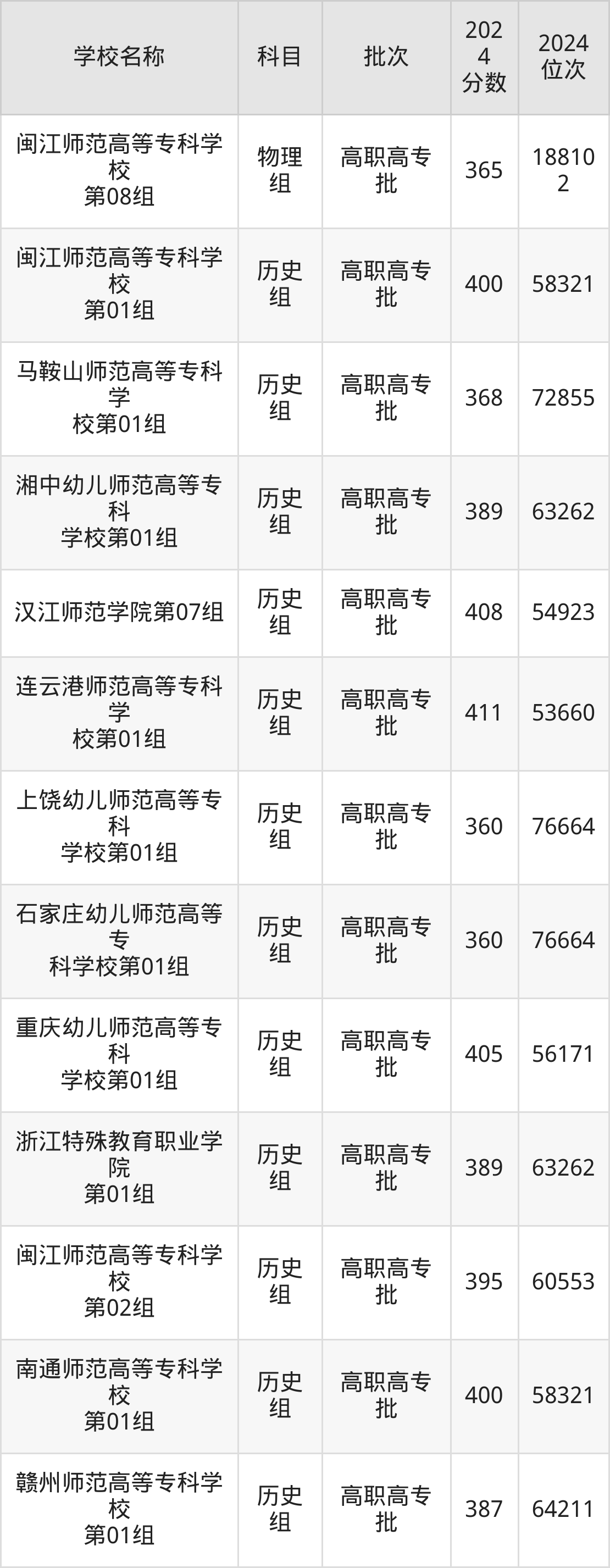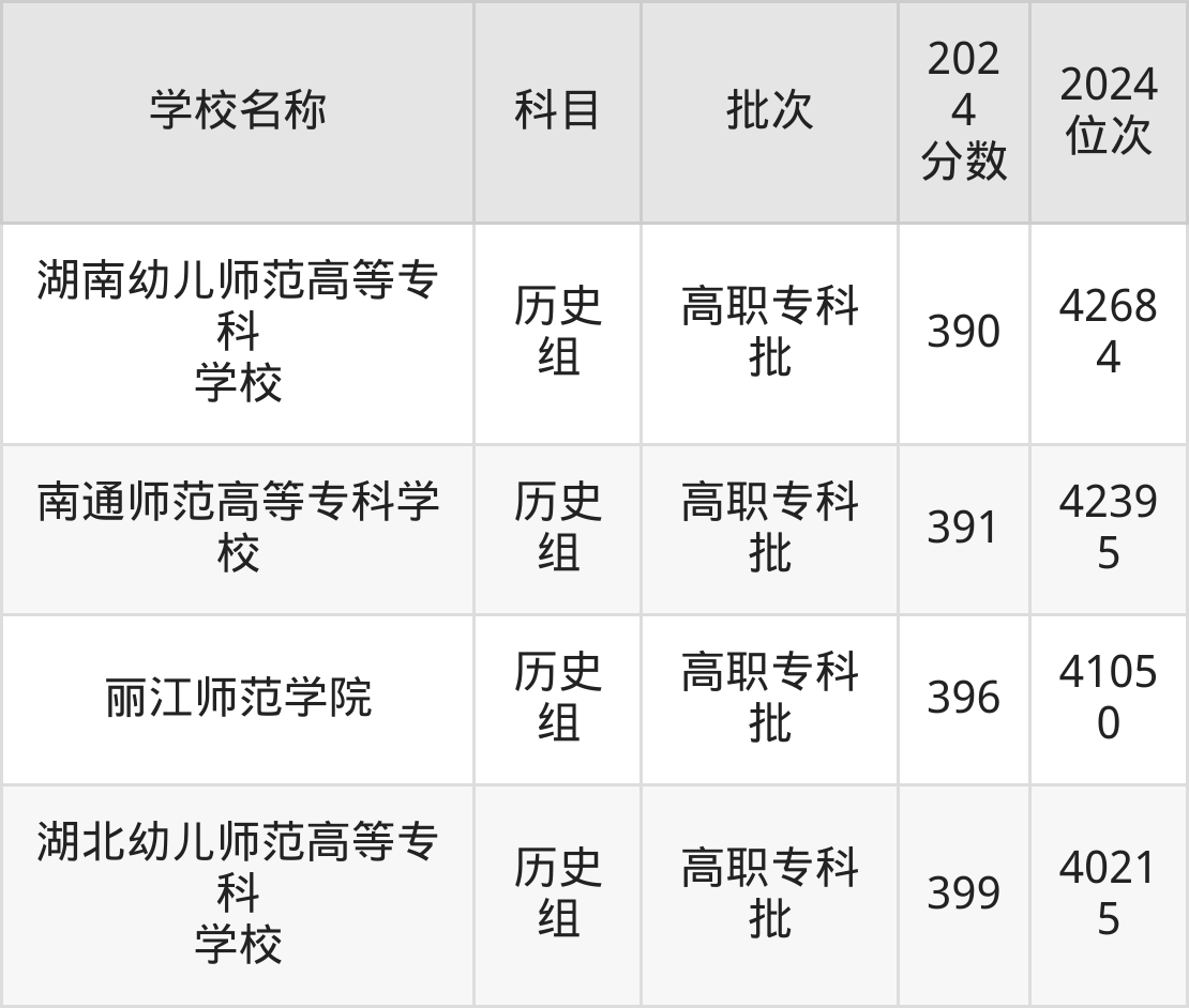 湖北高考历史组共有11所师范大学在350到420分之间录取,包含连云港师范高等专科学校、汉江师范学院、重庆幼儿师范高等专科学校、南通师范高等专科学校、闽江师范高等专科学校、浙江特殊教育职业学院、湘中幼儿师范高等专科学校、赣州师范高等专科学校、马鞍山师范高等专科学校、上饶幼儿师范高等专科学校。