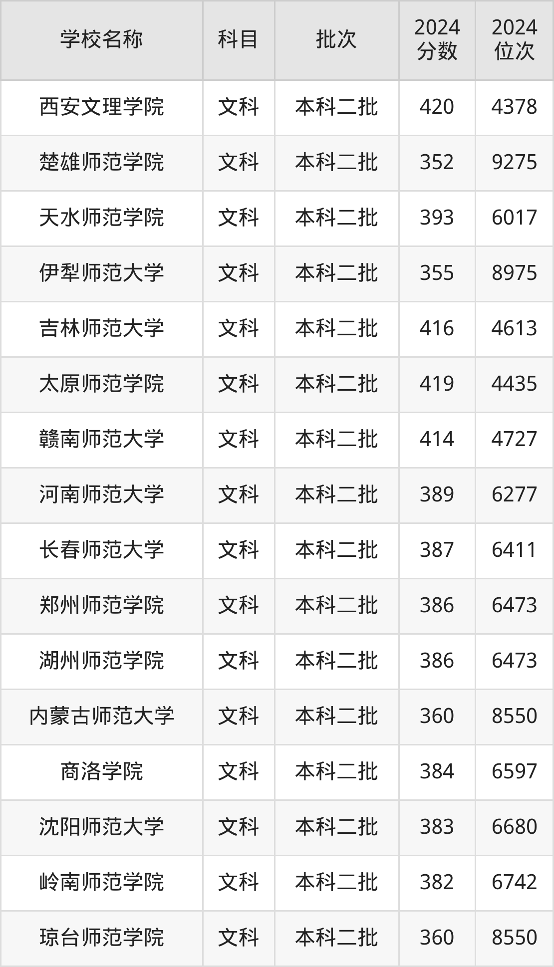 新疆高考文科共有41所师范大学在350到420分之间录取,包含西安文理学院、太原师范学院、辽宁师范大学、吉林师范大学、渭南师范学院、赣南师范大学、山西师范大学、闽南师范大学、曲阜师范大学、青海师范大学。
