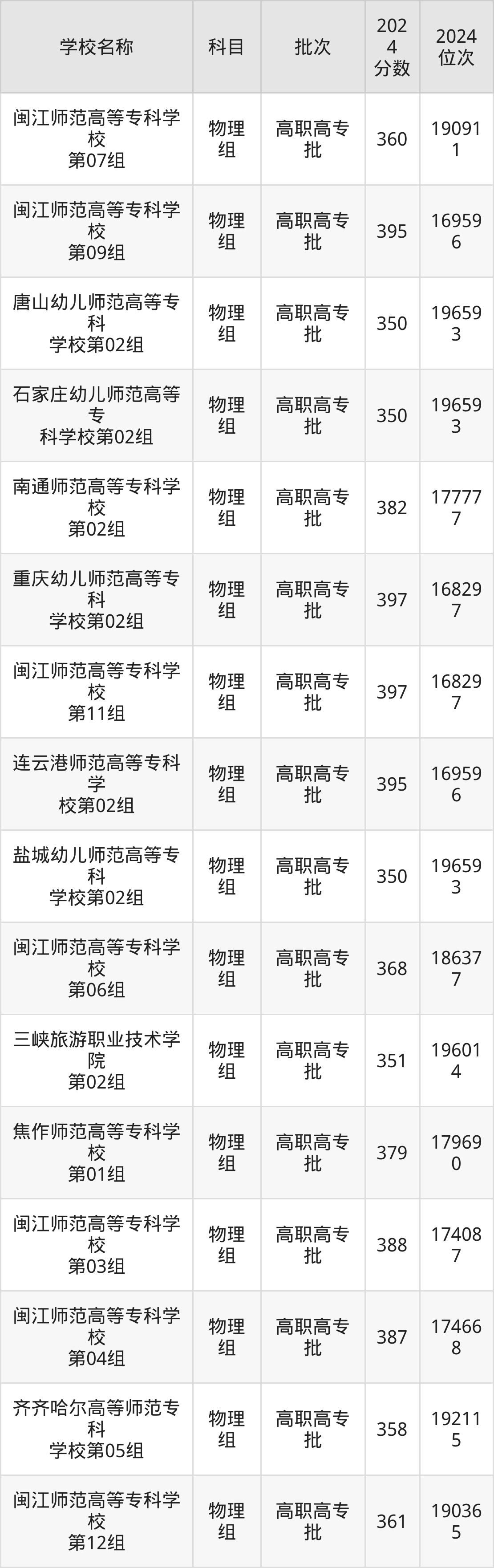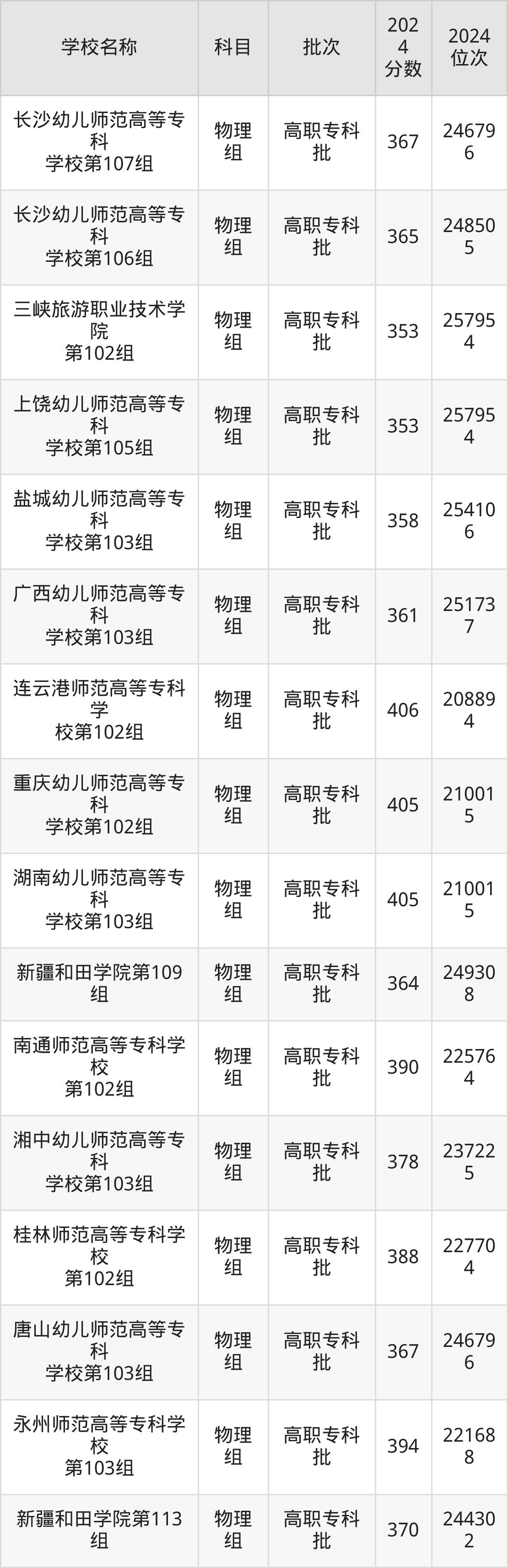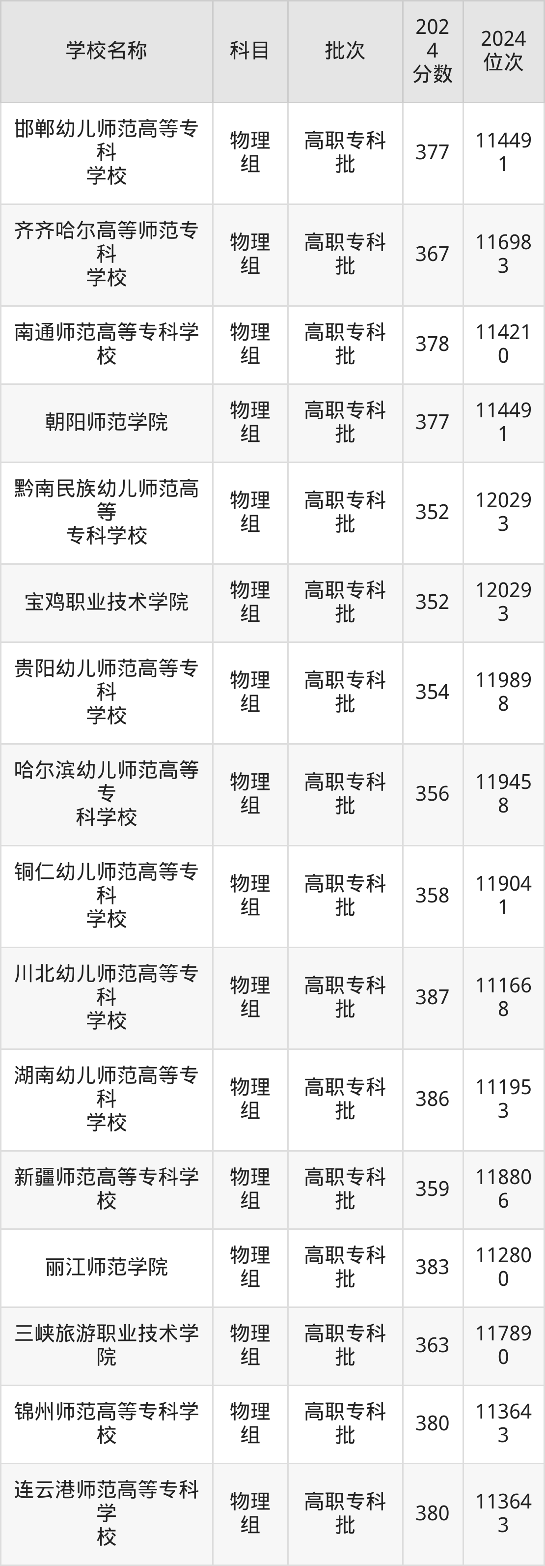 重庆高考物理组共有24所师范大学在350到420分之间录取,包含湘中幼儿师范高等专科学校、赣州师范高等专科学校、川北幼儿师范高等专科学校、湖南幼儿师范高等专科学校、丽江师范学院、锦州师范高等专科学校、连云港师范高等专科学校、南通师范高等专科学校、朝阳师范学院、邯郸幼儿师范高等专科学校。