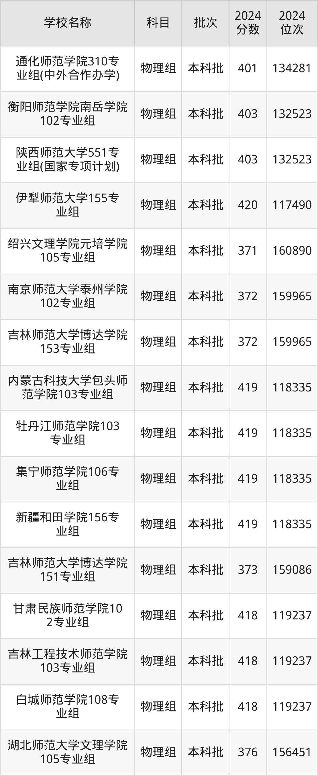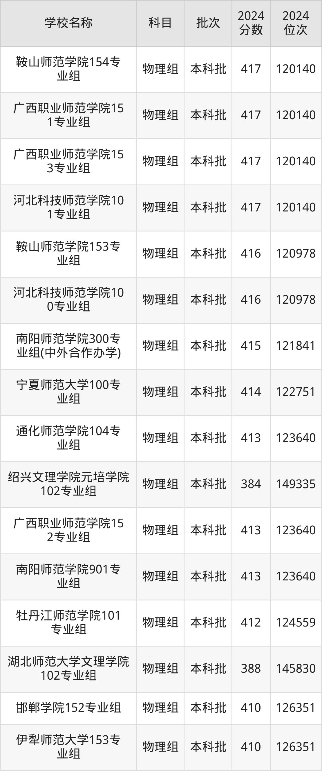 广西高考物理组共有33所师范大学在350到420分之间录取,包含天津师范大学、内蒙古科技大学包头师范学院、伊犁师范大学、牡丹江师范学院、集宁师范学院、新疆和田学院、甘肃民族师范学院、吉林工程技术师范学院、白城师范学院、鞍山师范学院。