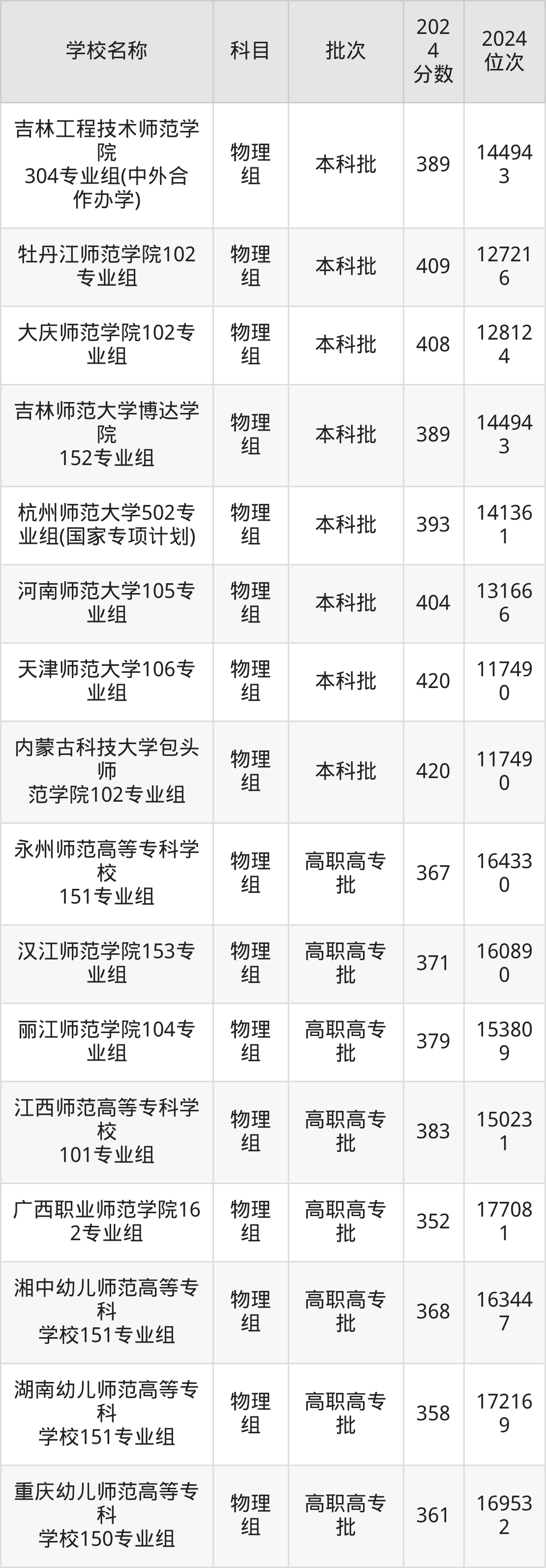 湖南高考物理组共有21所师范大学在350到420分之间录取,包含丽江师范学院、连云港师范高等专科学校、重庆幼儿师范高等专科学校、湖南幼儿师范高等专科学校、永州师范高等专科学校、朝阳师范学院、石家庄幼儿师范高等专科学校、闽江师范高等专科学校、南通师范高等专科学校、桂林师范高等专科学校。