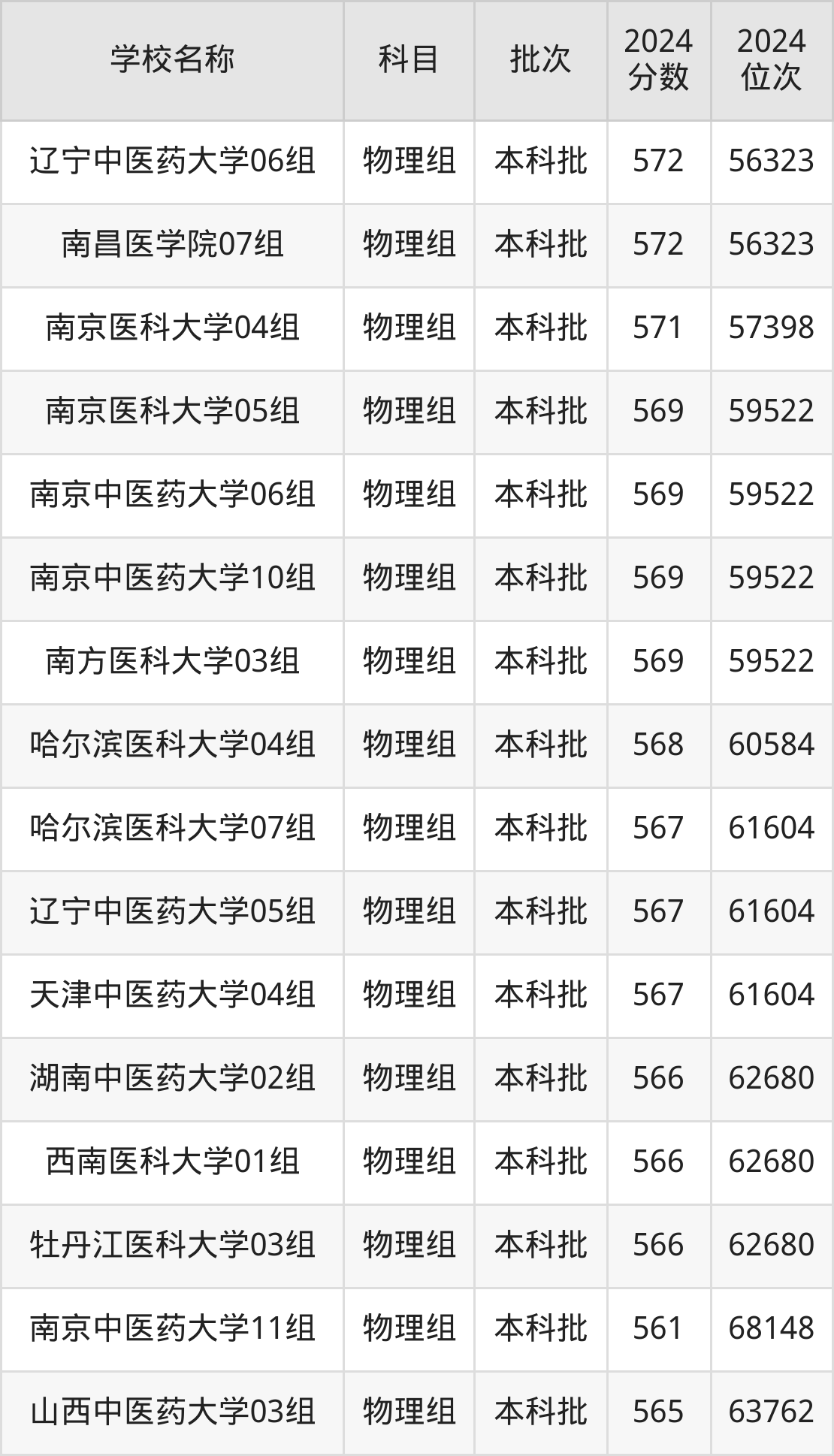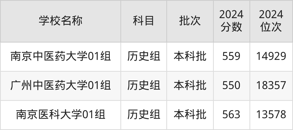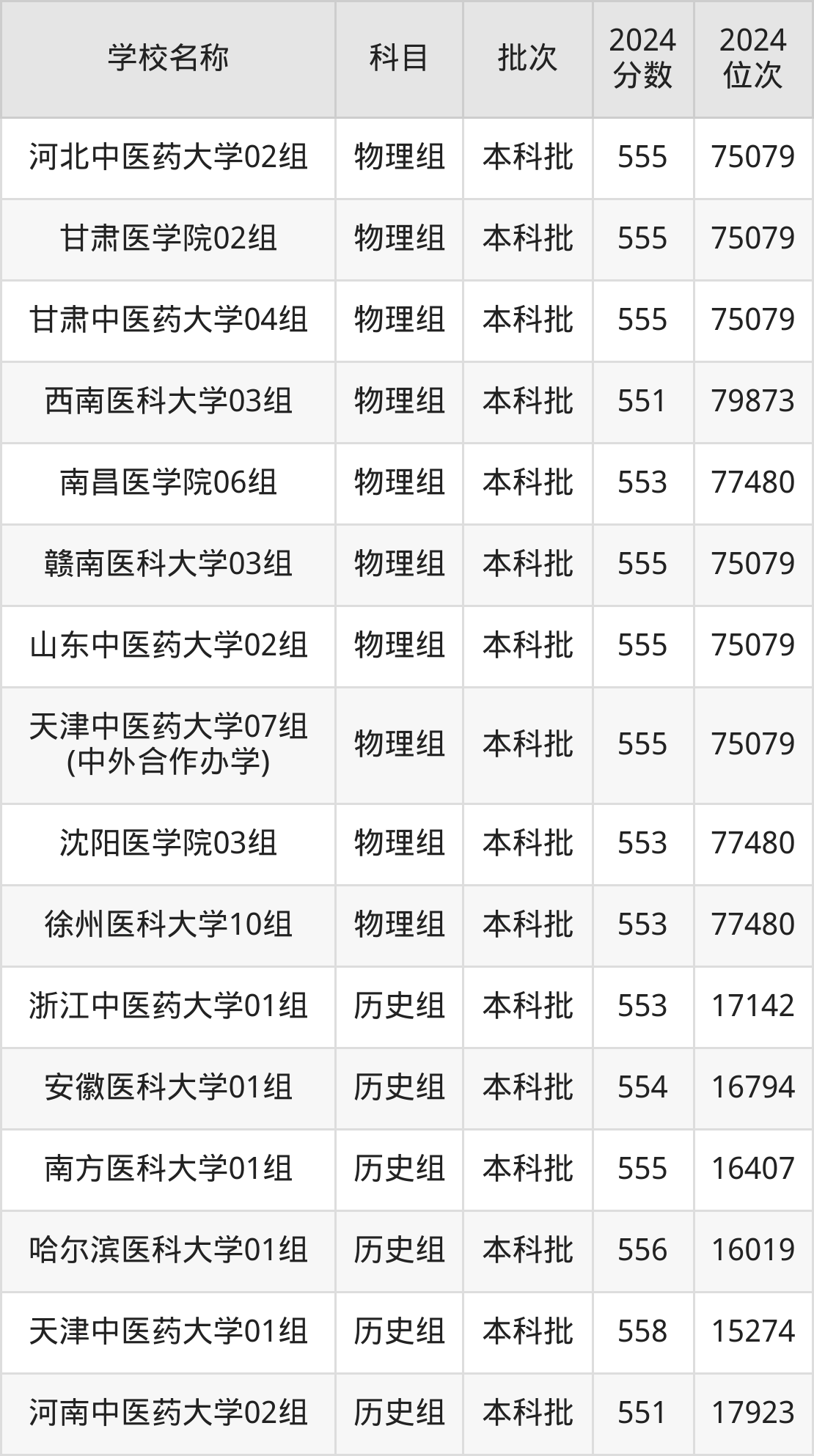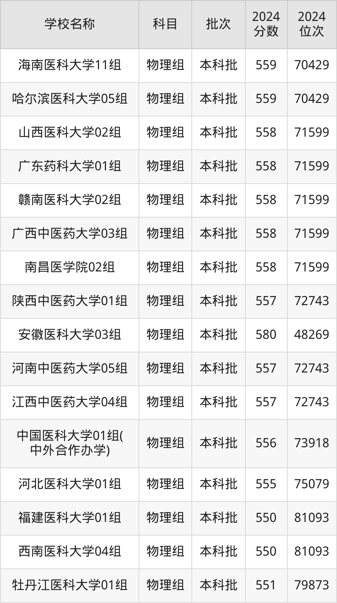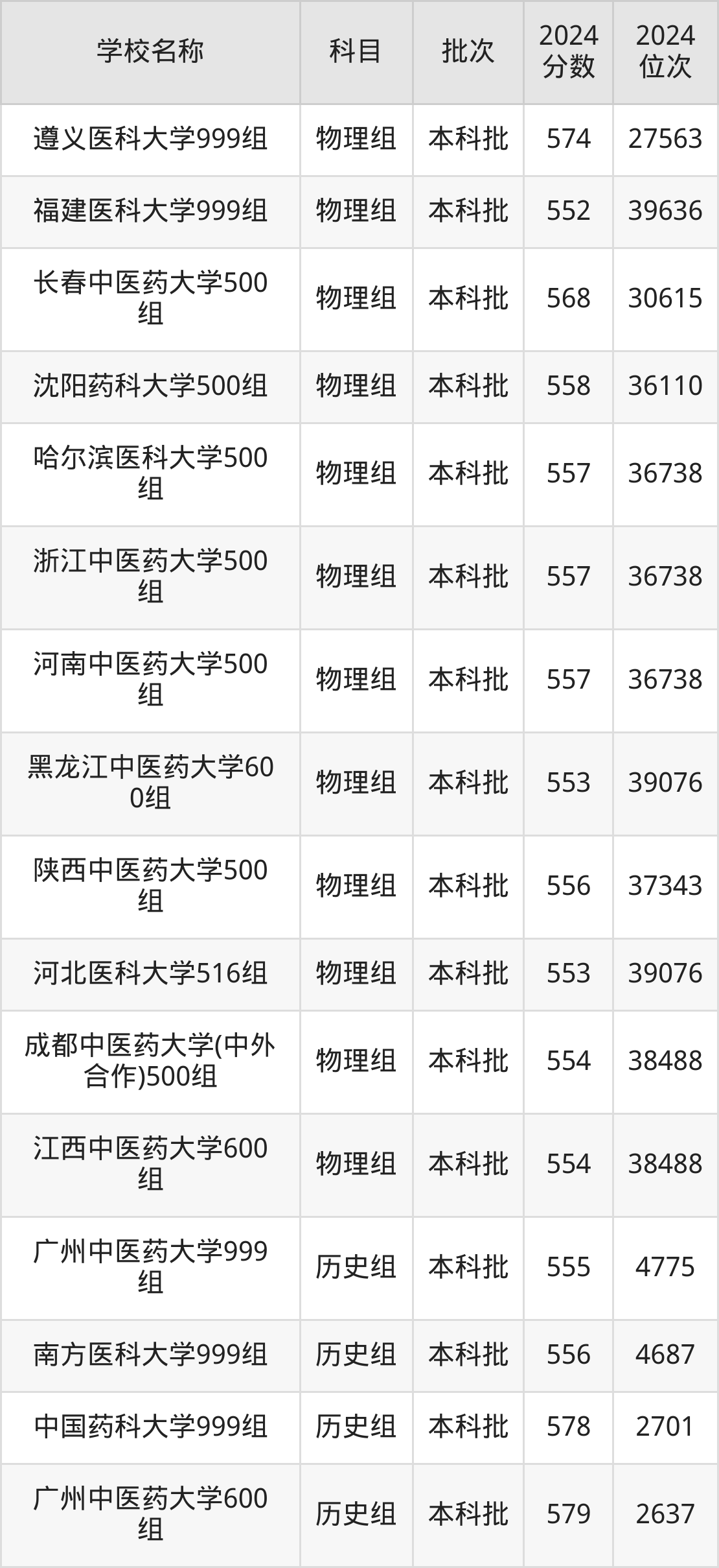 福建高考历史组共有4所医科大学在550到580分之间录取,包含广州中医药大学、中国药科大学、北京中医药大学、南方医科大学。