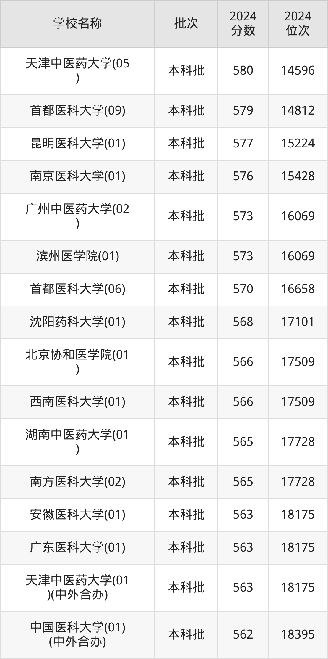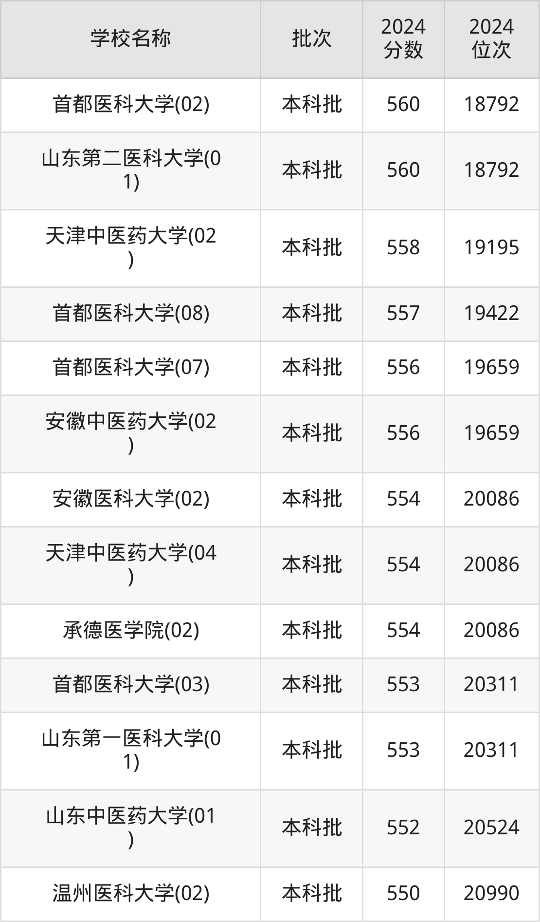 北京高考共有20所医科大学在550到580分之间录取,包含天津中医药大学、首都医科大学、昆明医科大学、南京医科大学、广州中医药大学、滨州医学院、沈阳药科大学、北京协和医学院、西南医科大学、湖南中医药大学。