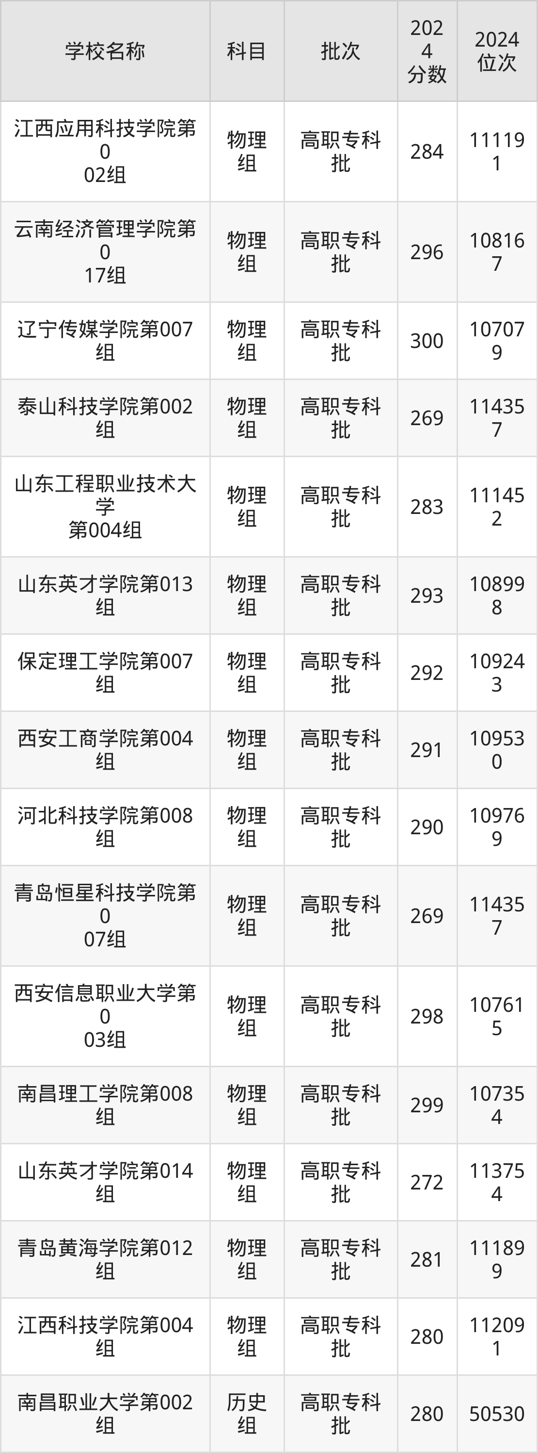 江西高考物理组共有11所二本民办大学在260到300分之间录取,包含南昌大学共青学院、浙江广厦建设职业技术大学、南昌理工学院、南昌职业大学、青岛恒星科技学院、西安汽车职业大学、上海中侨职业技术大学、西安信息职业大学、江西科技学院、景德镇艺术职业大学。