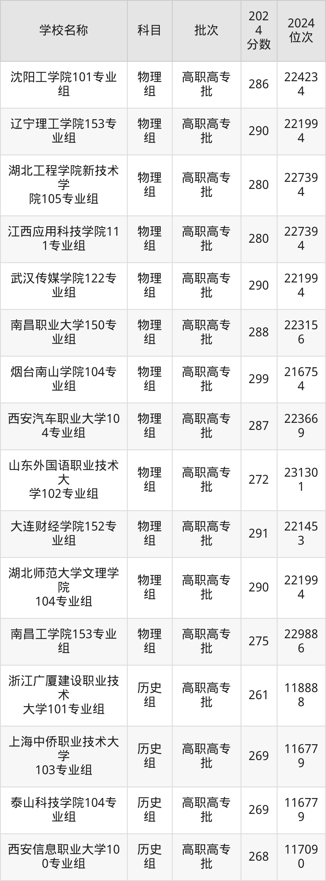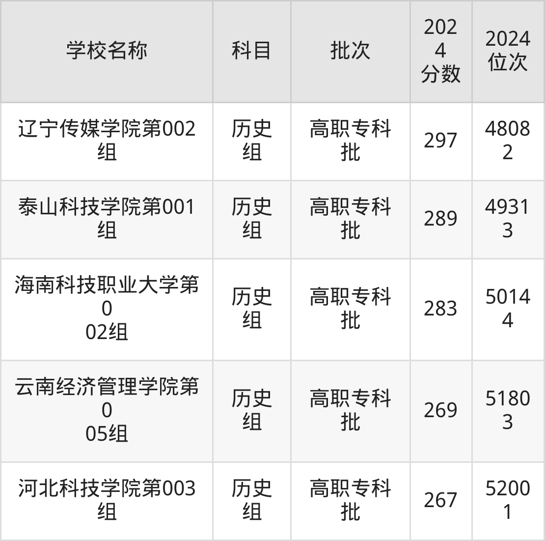 黑龙江高考历史组共有6所二本民办大学在260到300分之间录取,包含辽宁传媒学院、泰山科技学院、海南科技职业大学、南昌职业大学、云南经济管理学院、河北科技学院。