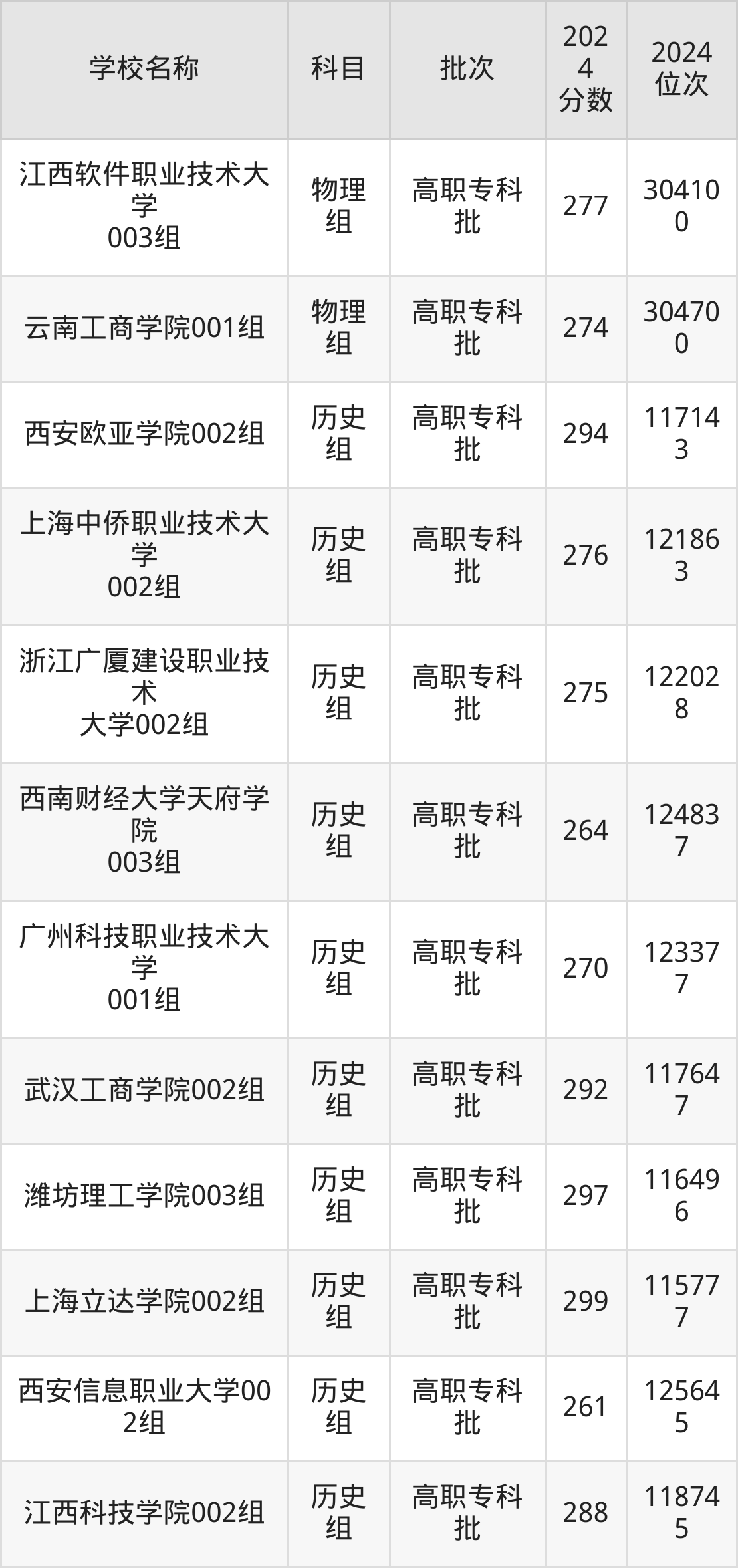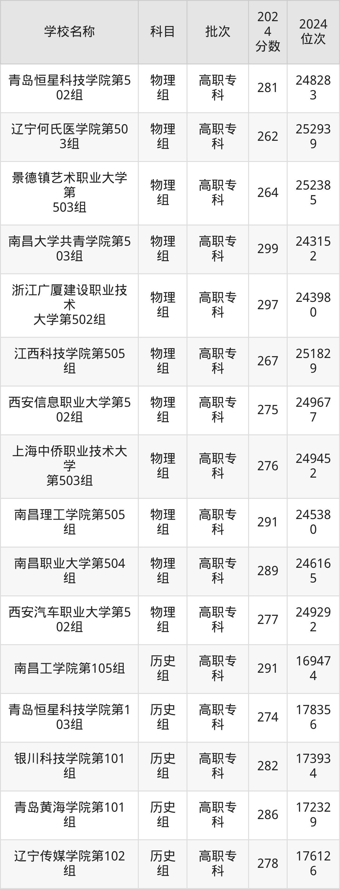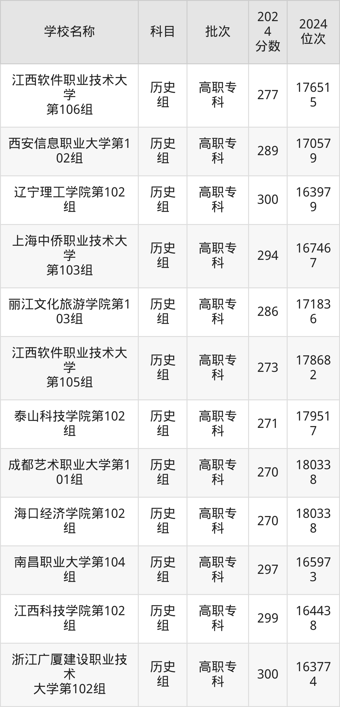 江西高考历史组共有16所二本民办大学在260到300分之间录取,包含辽宁理工学院、浙江广厦建设职业技术大学、江西科技学院、南昌职业大学、上海中侨职业技术大学、南昌工学院、西安信息职业大学、青岛黄海学院、丽江文化旅游学院、银川科技学院。