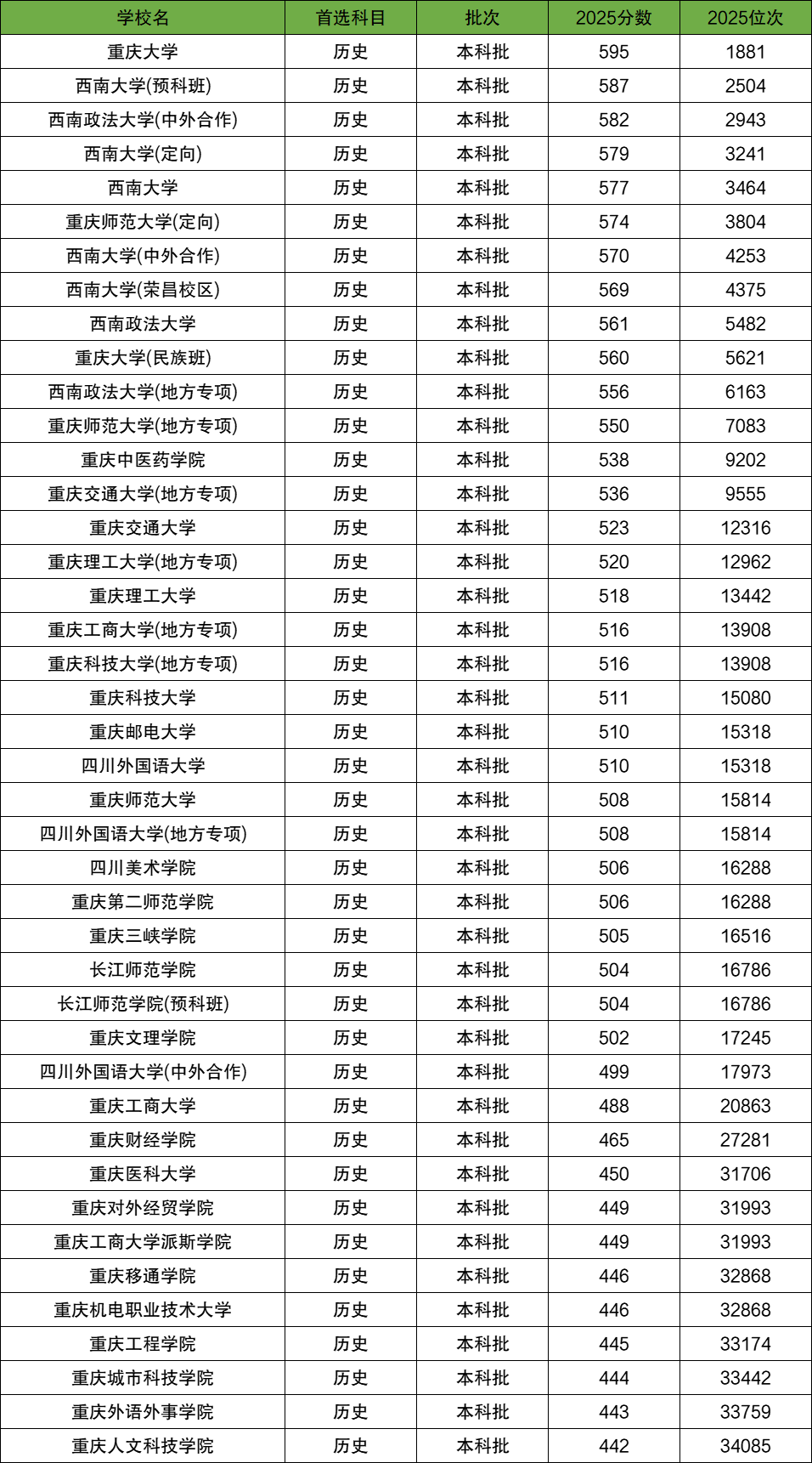 市内分数最高的大学是重庆大学,2025年录取分数线为595分,对应最低位次为1881名。这也是重庆市内历史类考生最难考的大学之一。