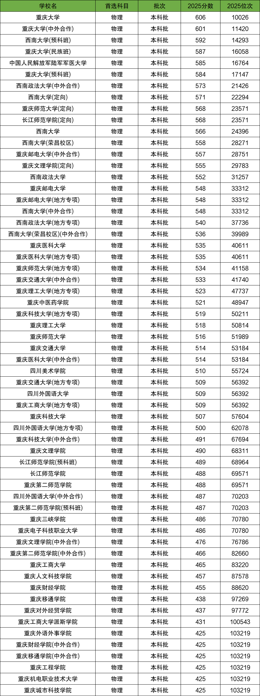 市内分数最高的大学是重庆大学,2025年录取分数线为606分,对应最低位次为10026名。这也是重庆市内物理类考生最难考的大学之一。