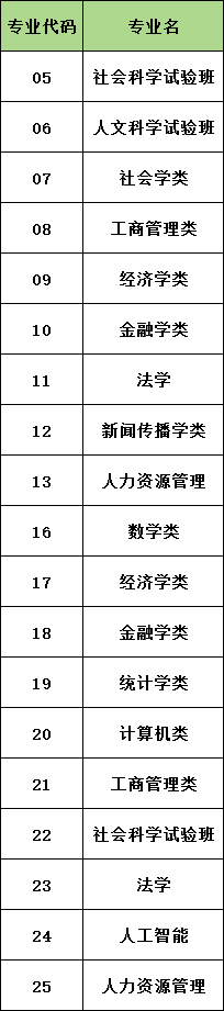 全国各大学在新疆招生的专业代码各不相同,一般而言,专业代码为2位数,同一专业不同专业方向的代码也会有差异。以中国人民大学为例,社会学类专业代码是07、工商管理类专业代码是08、经济学类专业代码是09等。篇幅有限,这里仅列举中国人民大学的本科志愿填报专业代码,以供参考: