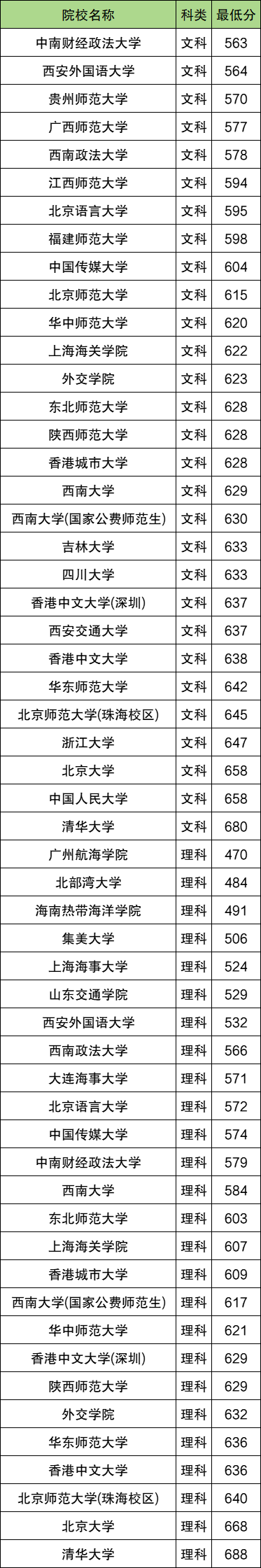 2024年云南省所有本科提前批录取分数线从470分到688分不等,其中文科最低分是563,对应的学校是中南财经政法大学;理科最低分是470,对应的学校是广州航海学院。