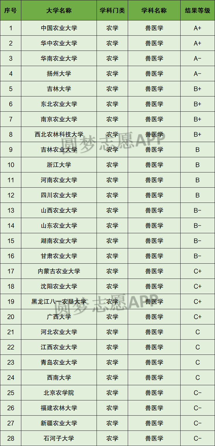 以下为第四轮学科评估中兽医学学科的全部排名,共计28所大学。