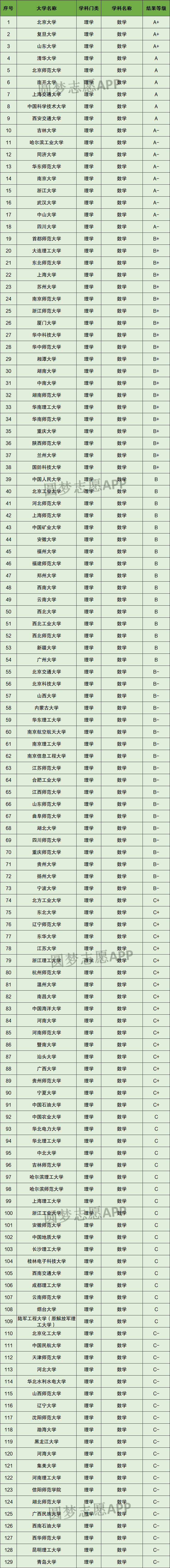 以下为第四轮学科评估中数学学科的全部排名,共计129所大学。