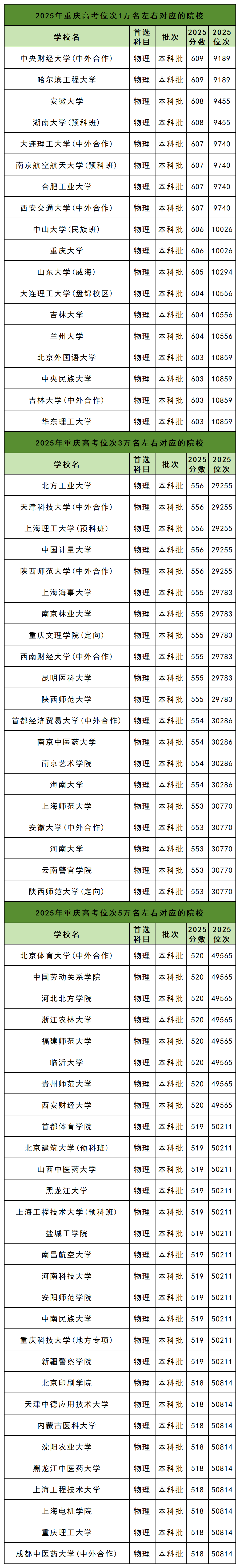 温馨提示:本文以2025年全国大学在重庆物理类的招录数据为例,展示不同位次排名对应的公办大学名单,以供2026届考生报考参考。