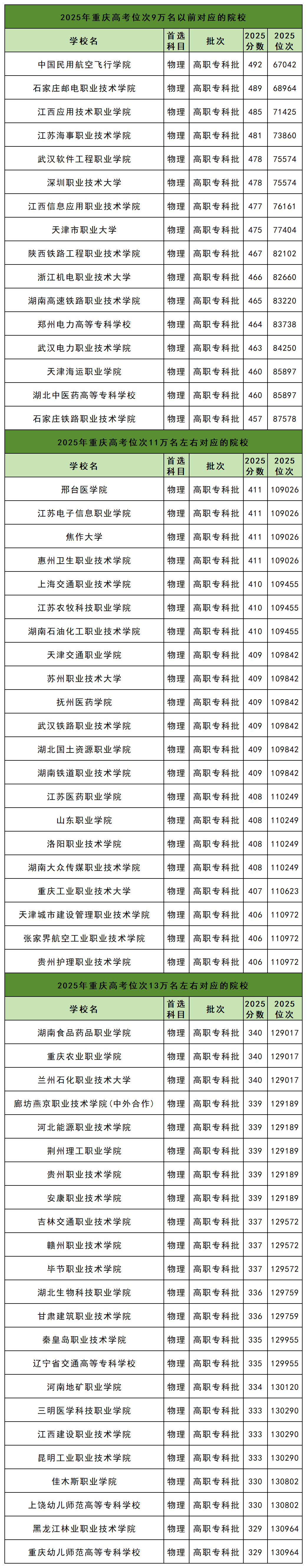 二、重庆高考位次排名对应公办专科
