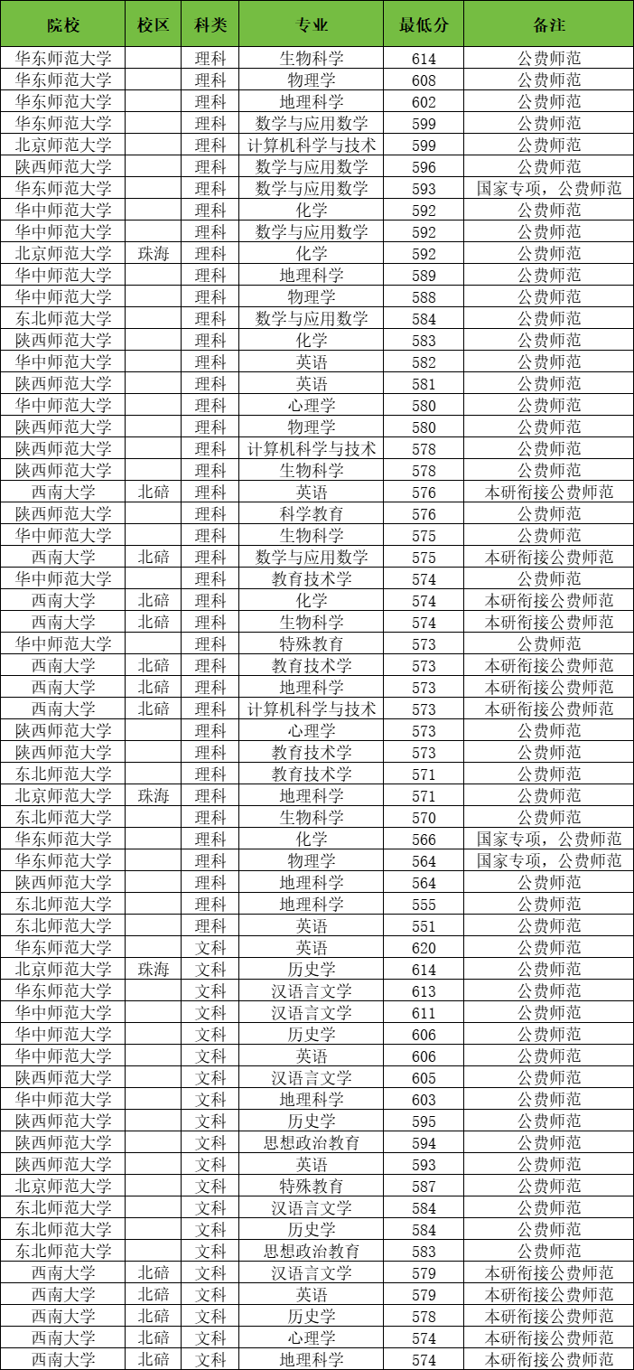 最低分的公费师范生院校及专业是西南大学的地理科学、心理学专业,录取分数线为574分。