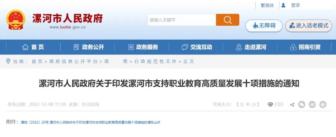 近日,漯河市人民政府网站发布了《漯河市人民政府关于印发漯河市支持职业教育高质量发展十项措施的通知》,明确提到支持漯河食品职业学院申办本科院校“漯河食品工程职业大学”;支持漯河医学高等专科学校申办本科院校“河南医药学院”;支持漯河职业技术学院改善办学条件,深化与河南工业大学合作,积极积累条件申办本科院校。