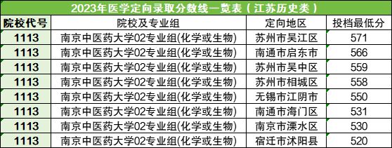 面向历史招生的都是南京中医药大学的02组,其中定向到苏州吴江区的录取线最高,分数是571分;定向到宿迁沭阳县的录取线最低,分数是520分。