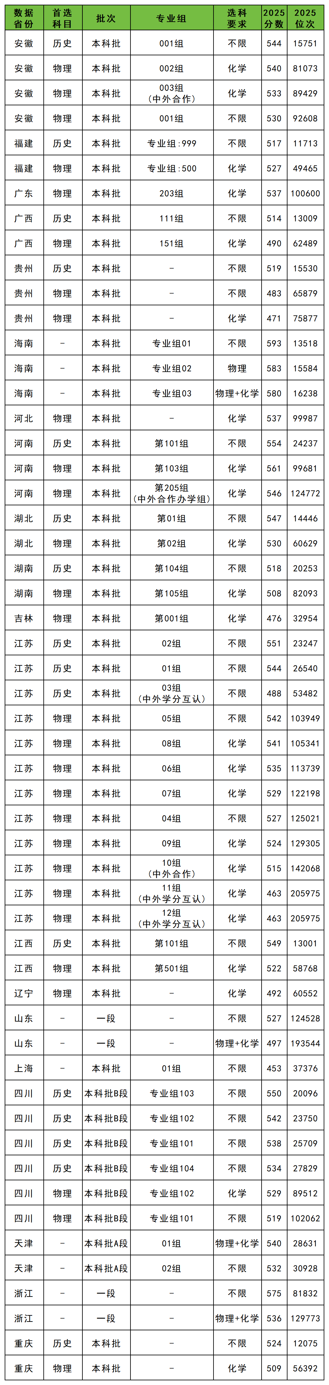 河北省本科批物理类普通类最低 537 分;辽宁省本科批物理类普通类最低 492 分;上海市本科批综合类不限选科专业最低 453 分;浙江省普通类一段,普通类最低 536 分。