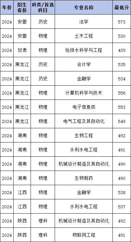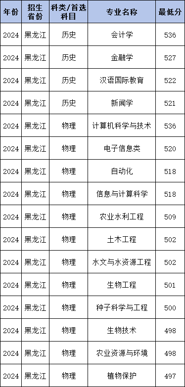 2024年黑龙江大学国家专项计划在江西录取最低分物理类为537分,物理组收分最低的专业为水利水电工程。