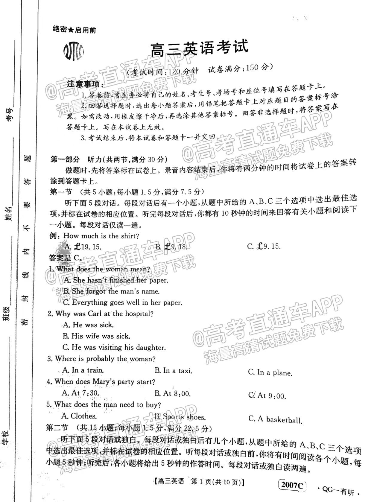 本次考试还未开始,等英语考试结束,英语的试题及答案一公布,小编将会在本文及时更新,同学们可以持续关注本文或高三100网站!