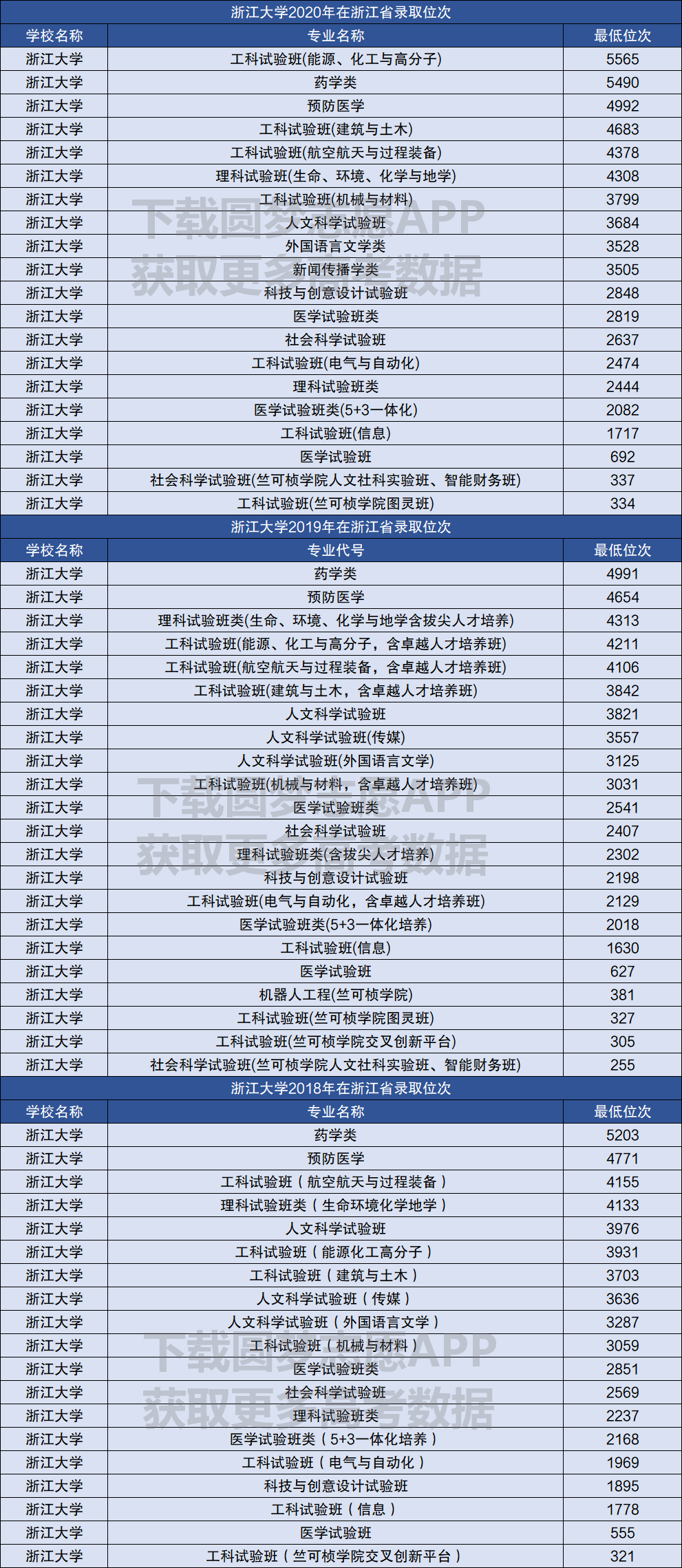 根据浙江省教育考试院2018-2020年普通类第一段平行投档分数线表,我们为大家整理了浙江大学在浙江省各专业录取位次,具体如下: