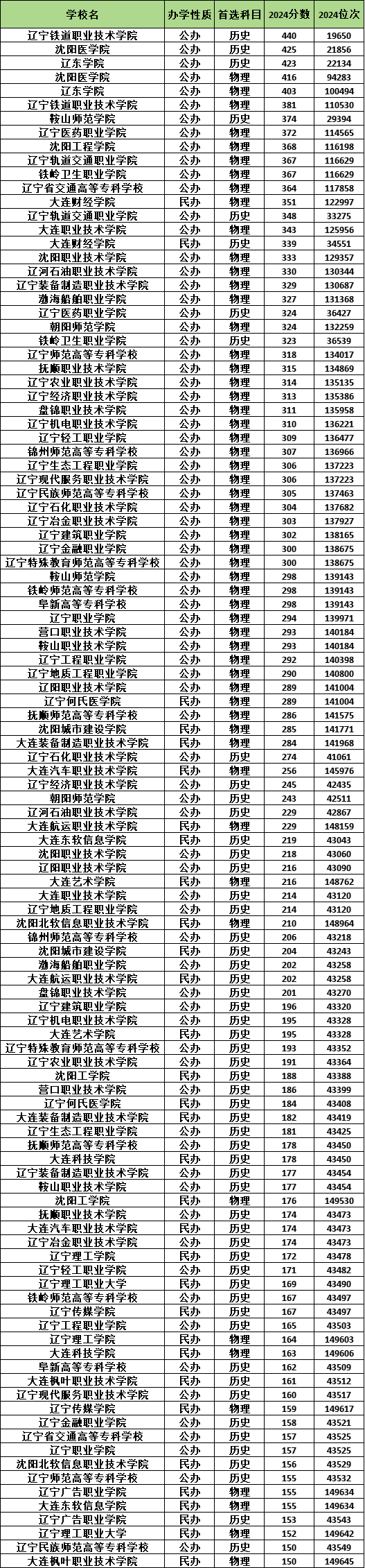 我们以辽宁高职大专在辽宁本省2024年招生的分数线为例,我们可以通过数据看看分数高、分数低的大专都有哪些。