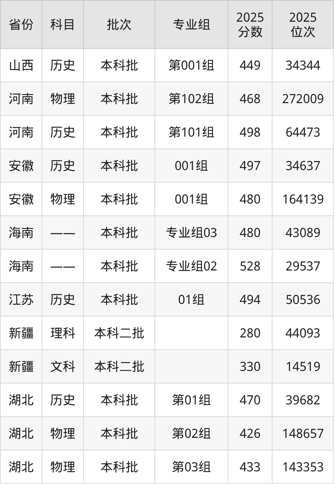 2025年在本科历史类进行招生,各专业组分数线详情如下: