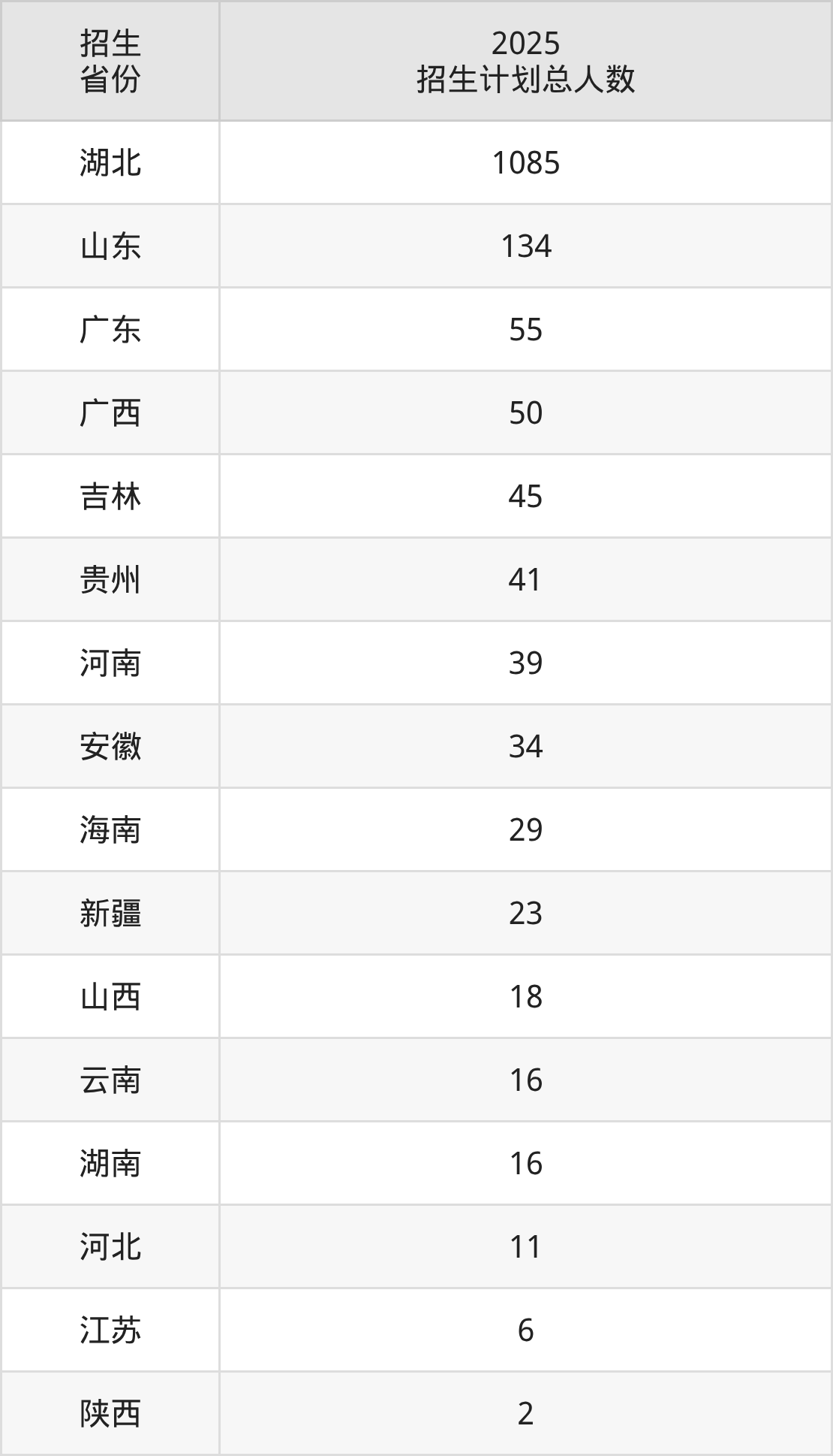 2025年汉口学院面向全国16个省市开展本科招生;招生专业共23个,招生人数共1604人。2025年在湖北省招生计划总人数是1085人,其中,汉口学院在湖北省招生人数最多的是汉语言文学。汉口学院在各省具体招生人数情况如下表。