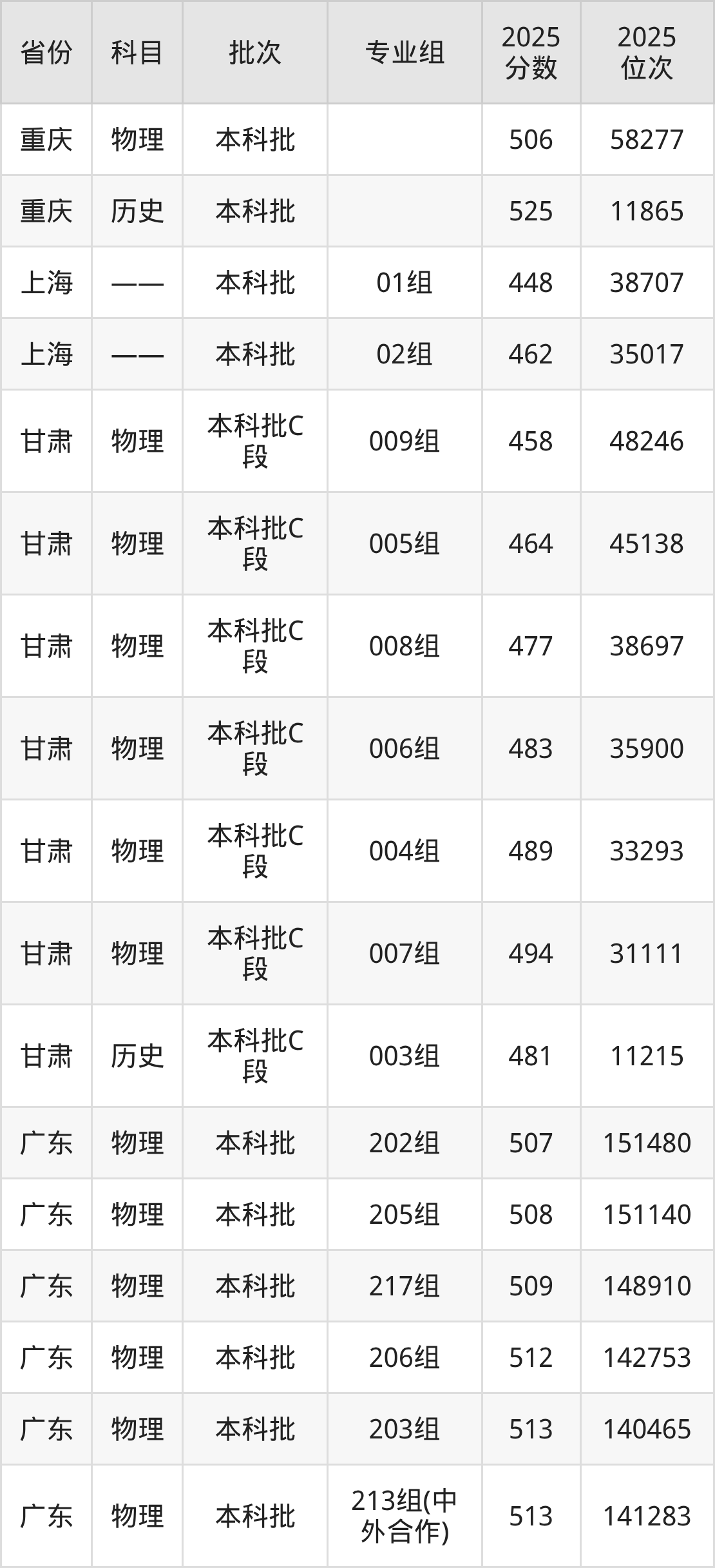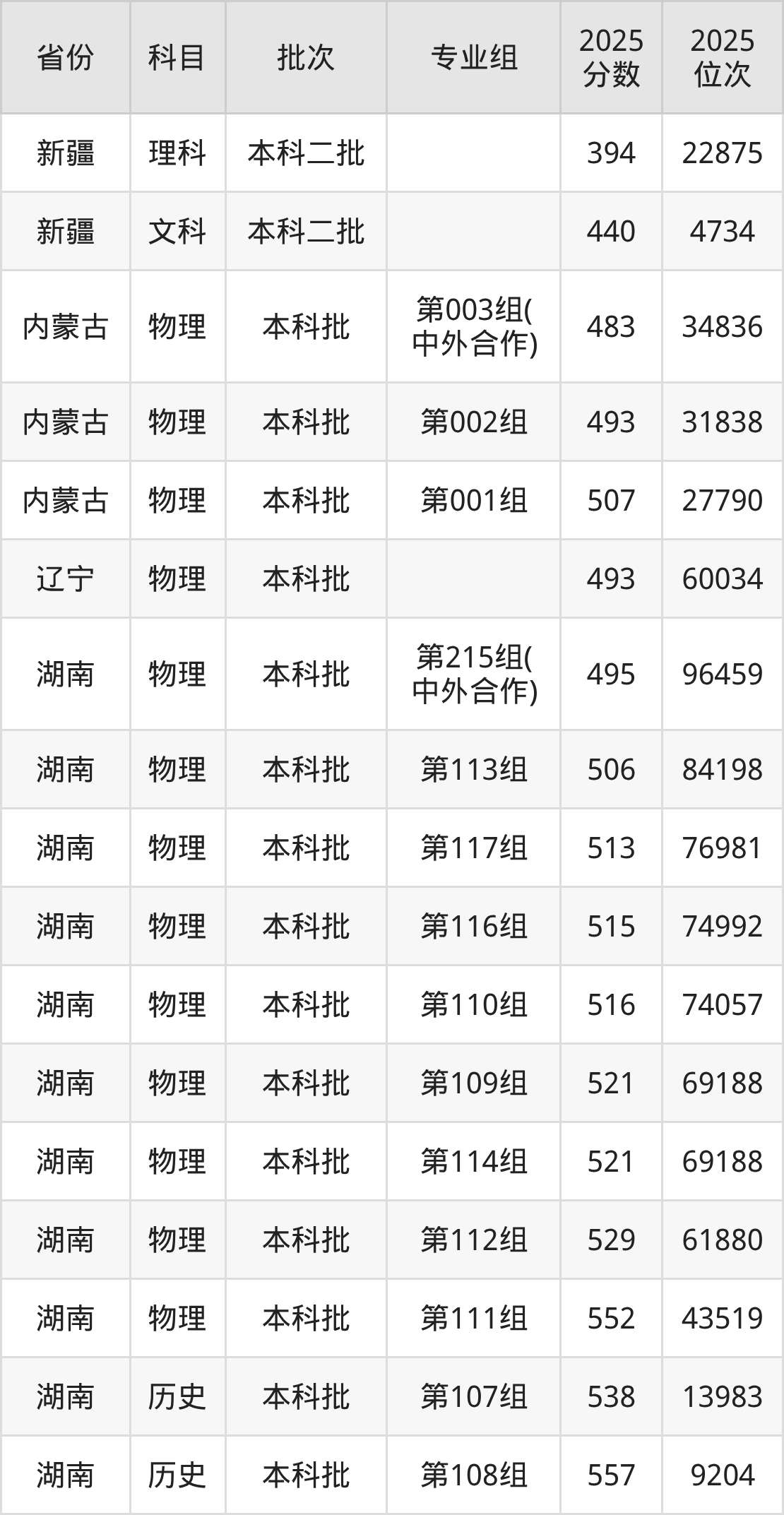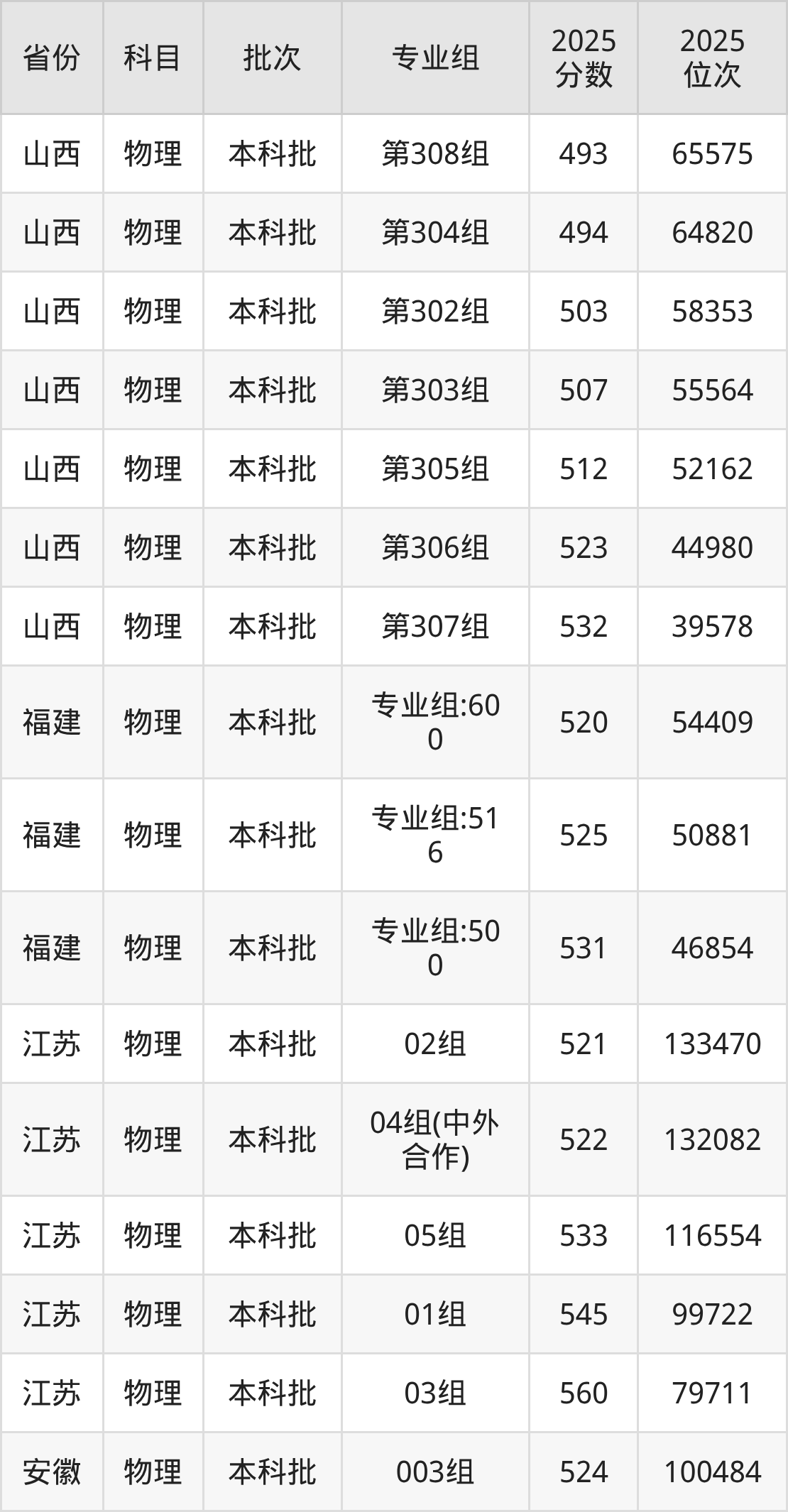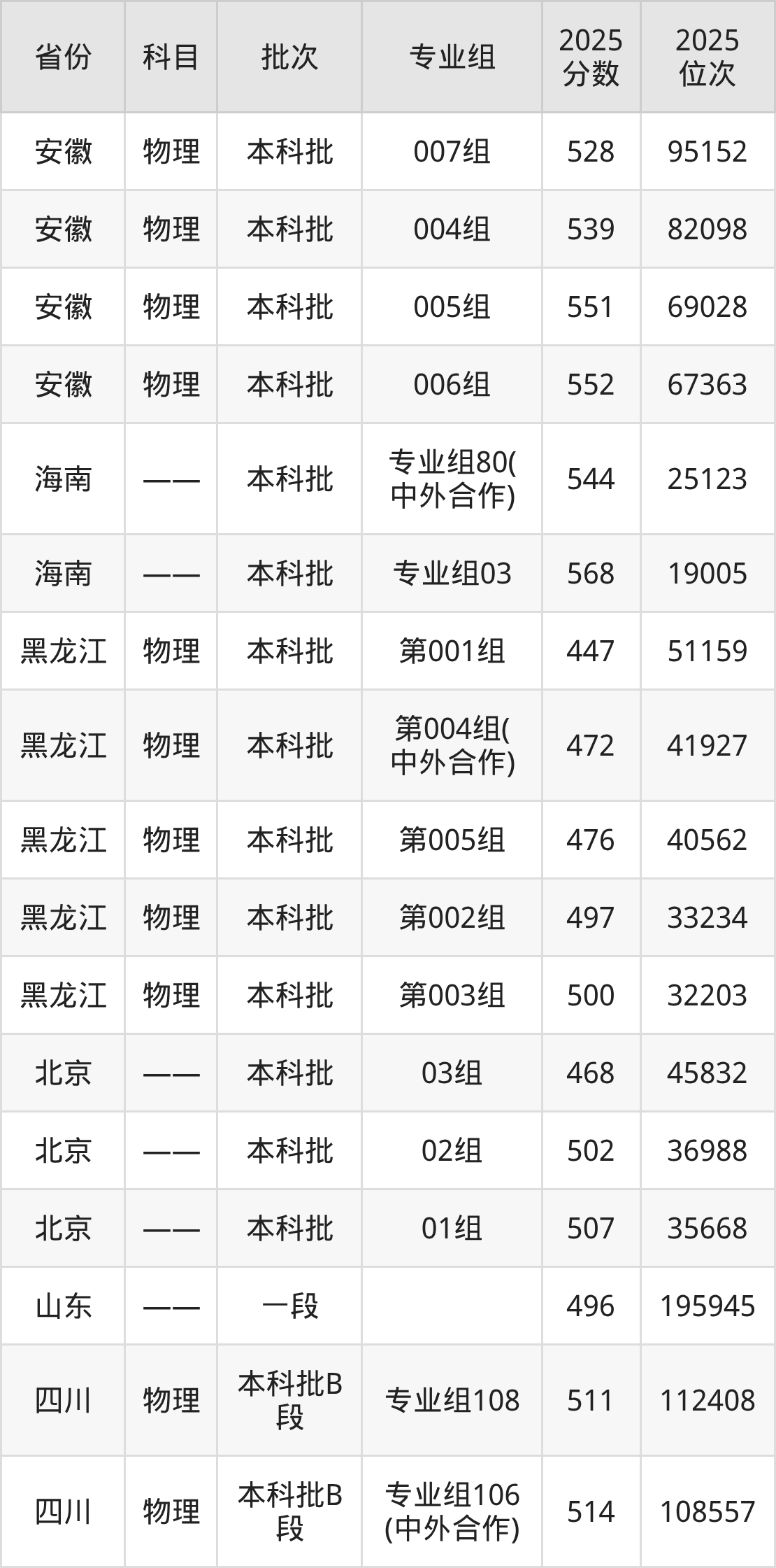 2025年在本科物理类进行招生,各专业组分数线详情如下: