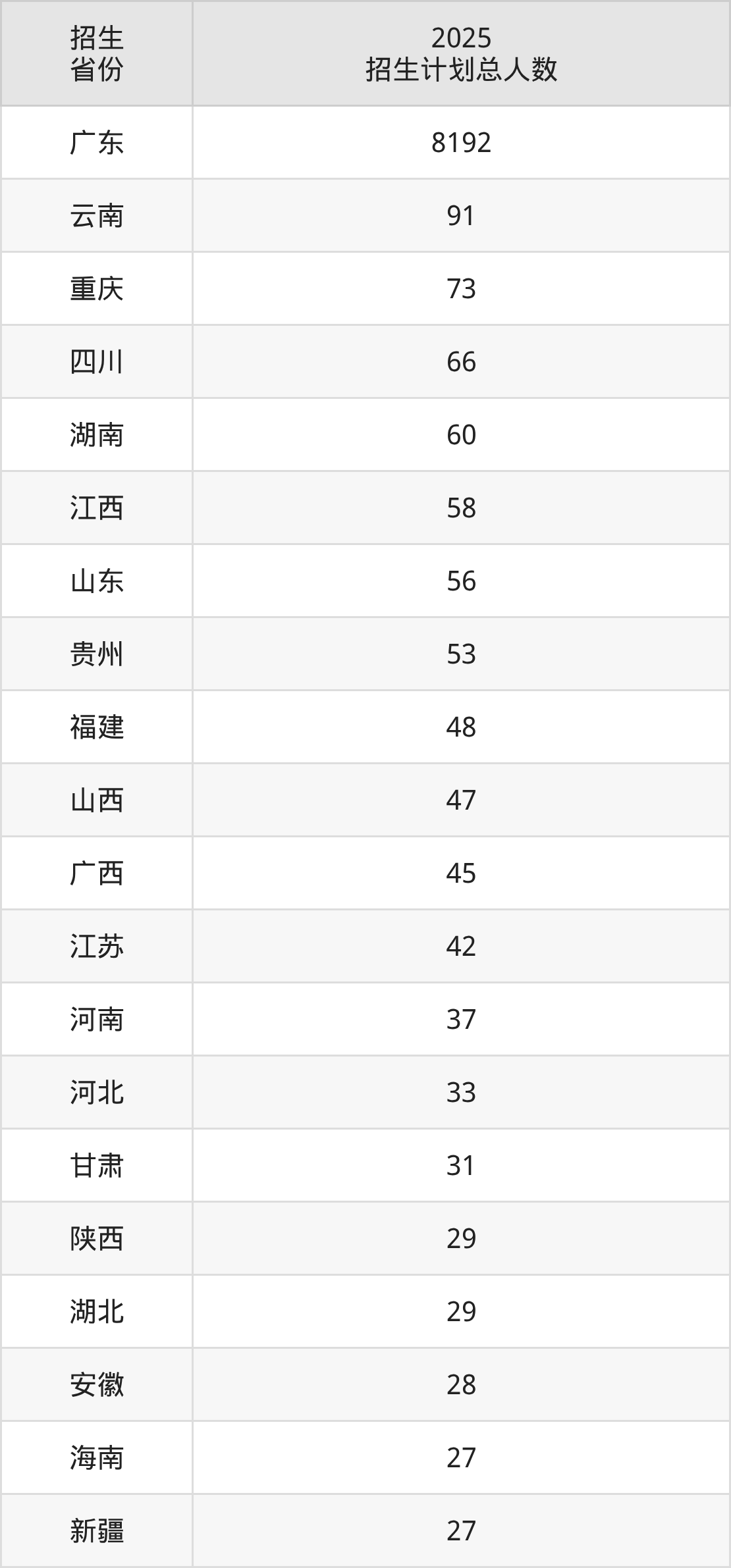 2025年广东海洋大学面向全国27个省市开展本科招生;招生专业共65个,招生人数共9140人。2025年在广东省招生计划总人数是8192人,其中,广东海洋大学在广东省招生人数最多的是英语。广东海洋大学在各省具体招生人数情况如下表。