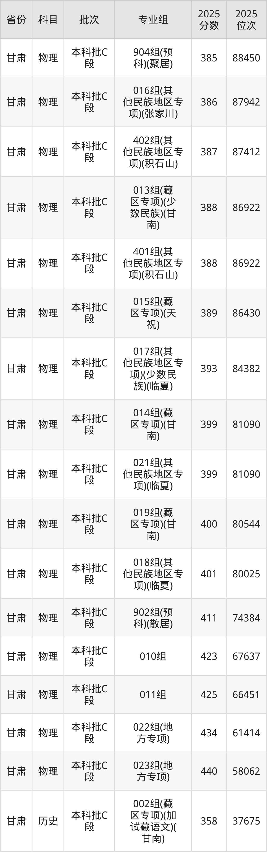兰州石化职业技术大学020专业组(其他民族地区专项)(张家川):2025年投档录取最低分为385分,录取最低位次为88450名。