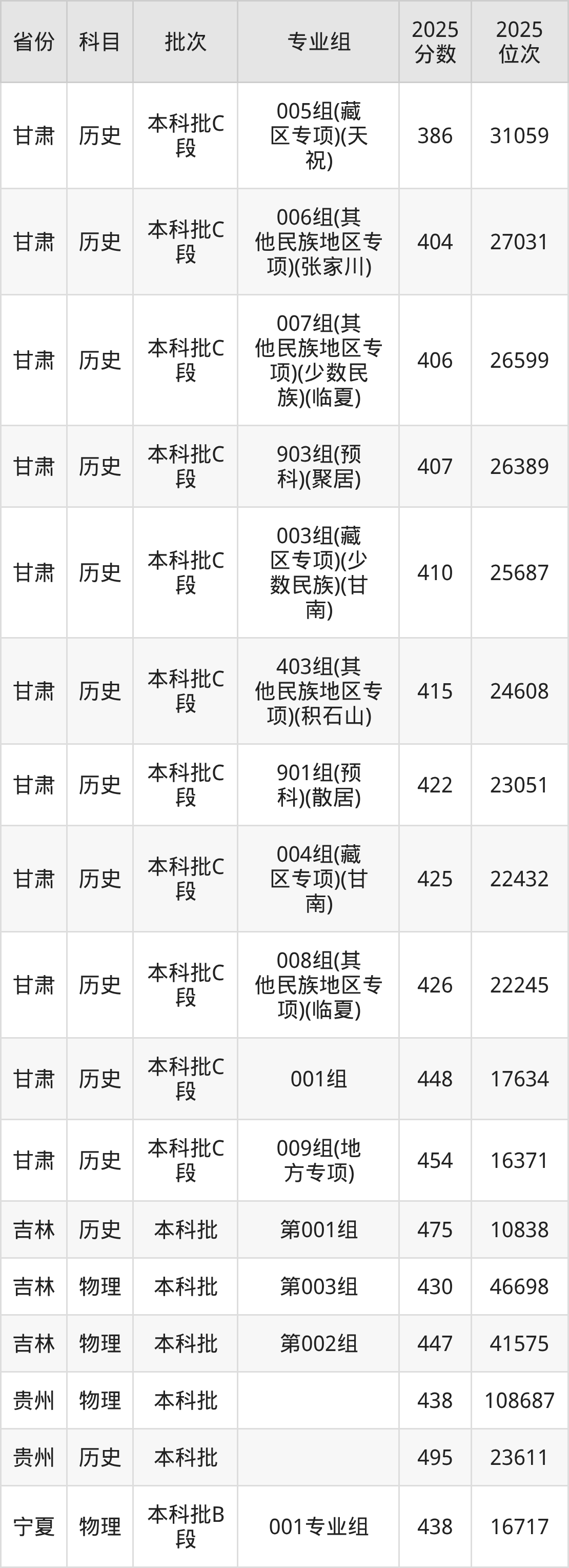 兰州石化职业技术大学003专业组(藏区专项)(少数民族)(甘南):2025年投档录取最低分为410分,录取最低位次为25687名。