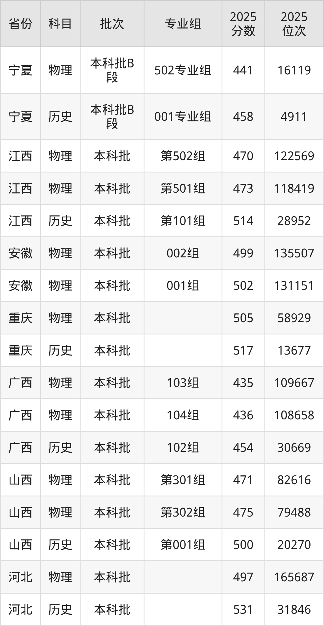 2025年投档录取最低分为505分,录取最低位次为58929名。