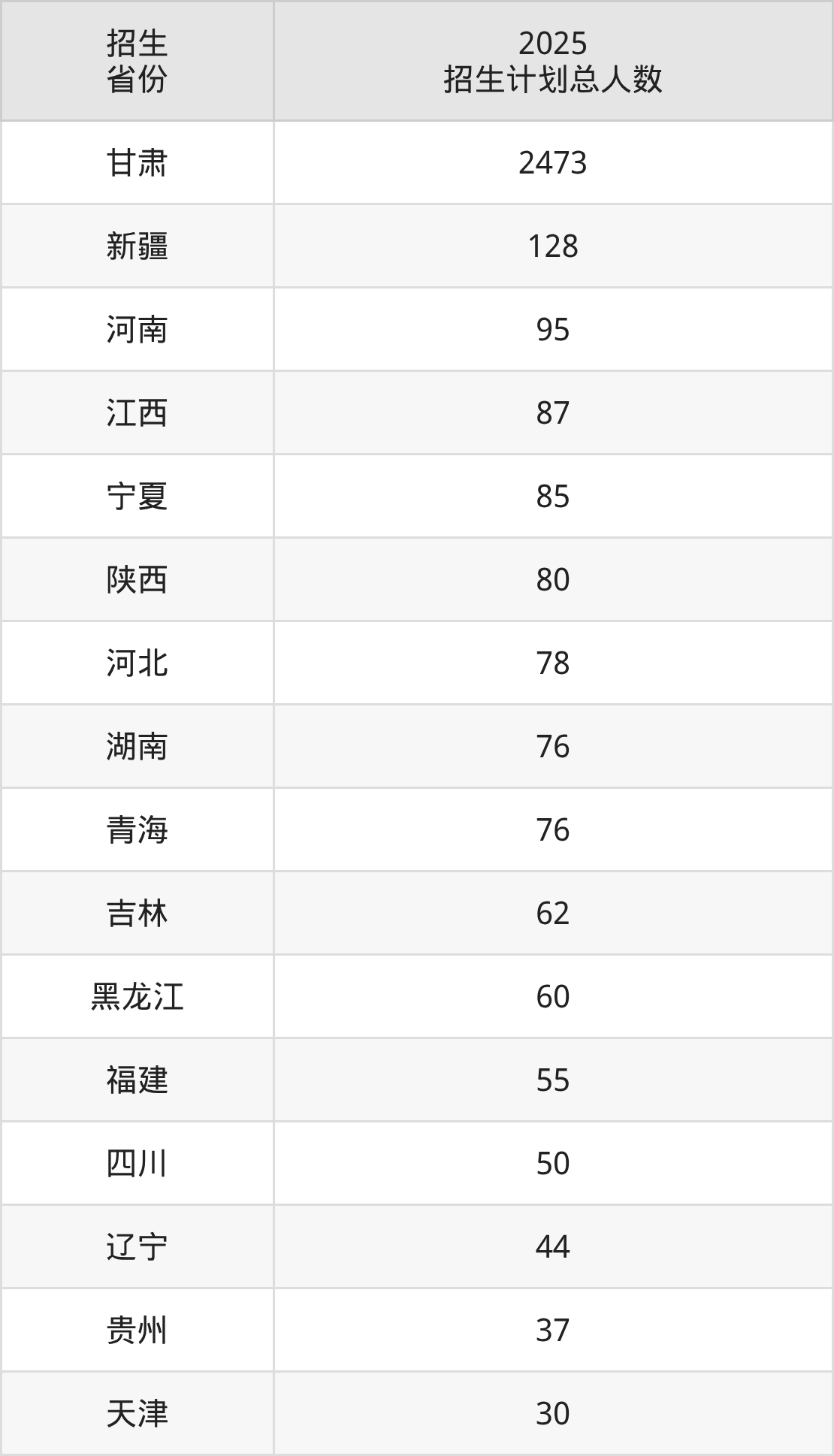 2025年兰州石化职业技术大学面向全国26个省市开展本科招生;招生专业共21个,招生人数共1993人。2025年在甘肃省招生计划总人数是2473人,其中,兰州石化职业技术大学在甘肃省招生人数最多的是建筑工程。兰州石化职业技术大学在各省具体招生人数情况如下表。